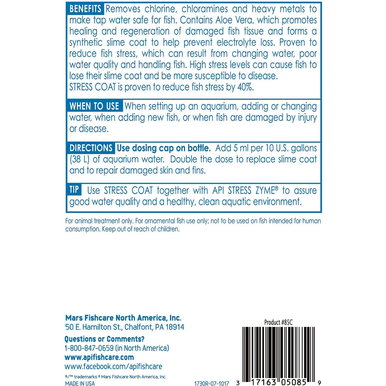 Give your fish long-lasting relief from stress and harmful chemicals with API Stress Coat Aquarium Water Conditioner. This fast-acting formula conditions tap water for use in freshwater aquariums. Stress Coat helps reduce the chlorine, chloramines and heavy metals in tap water that can harm your finned friend. Use when starting an aquarium, adding a new fish, or during routine water changes—the soothing aloe vera helps replace and protect your fish’s slime coat for added safety. Plus, each five gallon container treats over 7,600 gallons of water for long-lasting protection!