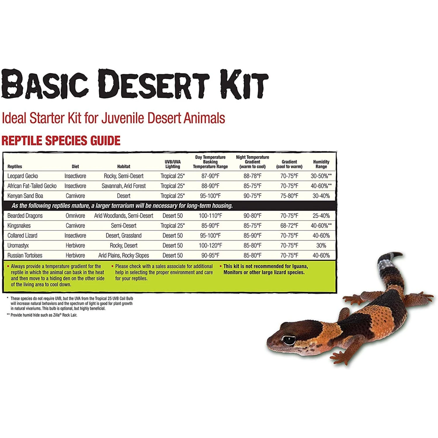 - Complete kit lets you get started raising desert-dwelling reptiles from juveniles, with glass enclosure, substrate, lights, gauge and set-up guide.
