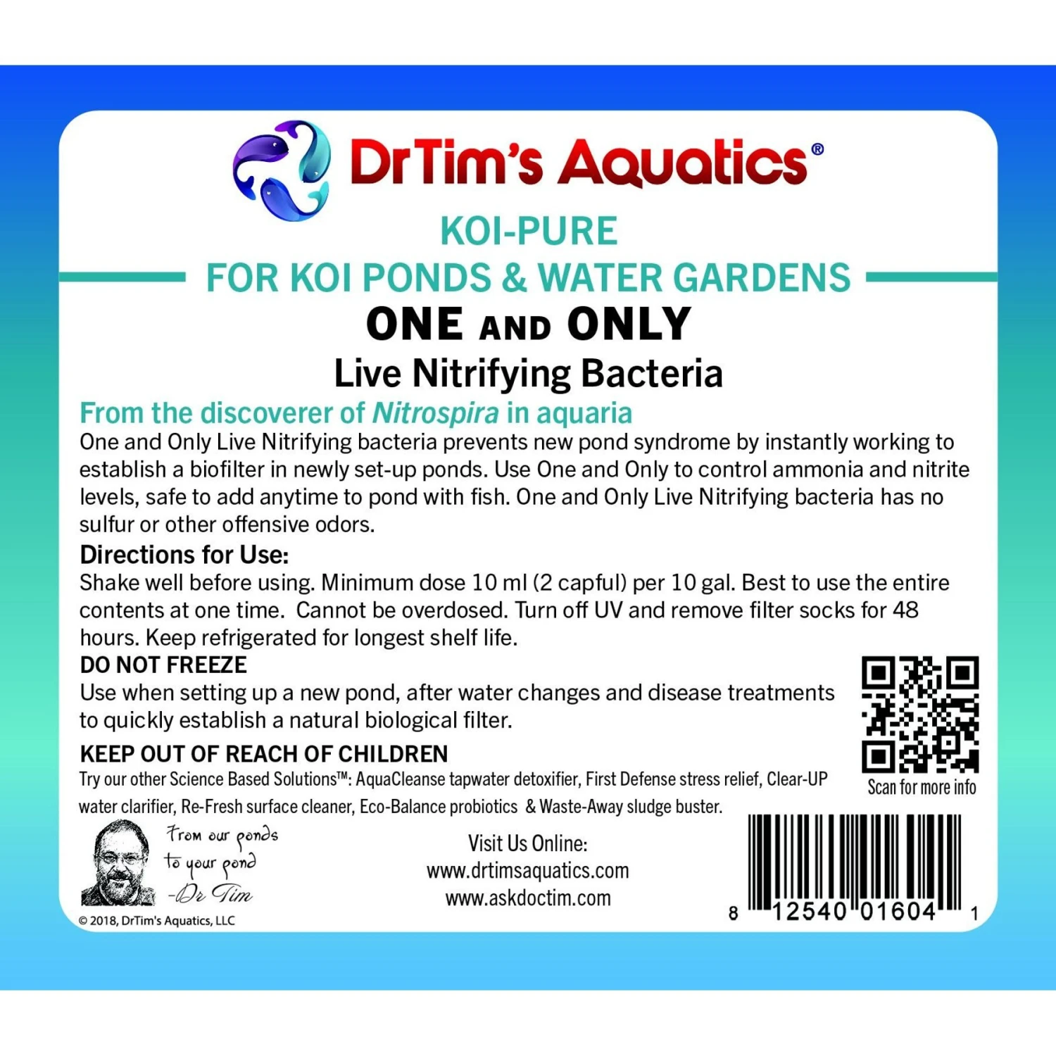 Give your koi the perfect pond to play in with Dr. Tim’s Aquatics Koi One and Only Aquarium Cleaner. This cleaner helps eliminate new pond syndrome by setting up a biological filter in your new pond or water garden. It’s designed to safely remove toxic chemicals that could harm your fishy friends—including ammonia and nitrite. This completely natural cleaner is formulated so it cannot be overdosed and you can safely put your fish immediately back into their fin-tastic new abode after treatment. Welcome home, little buddies!