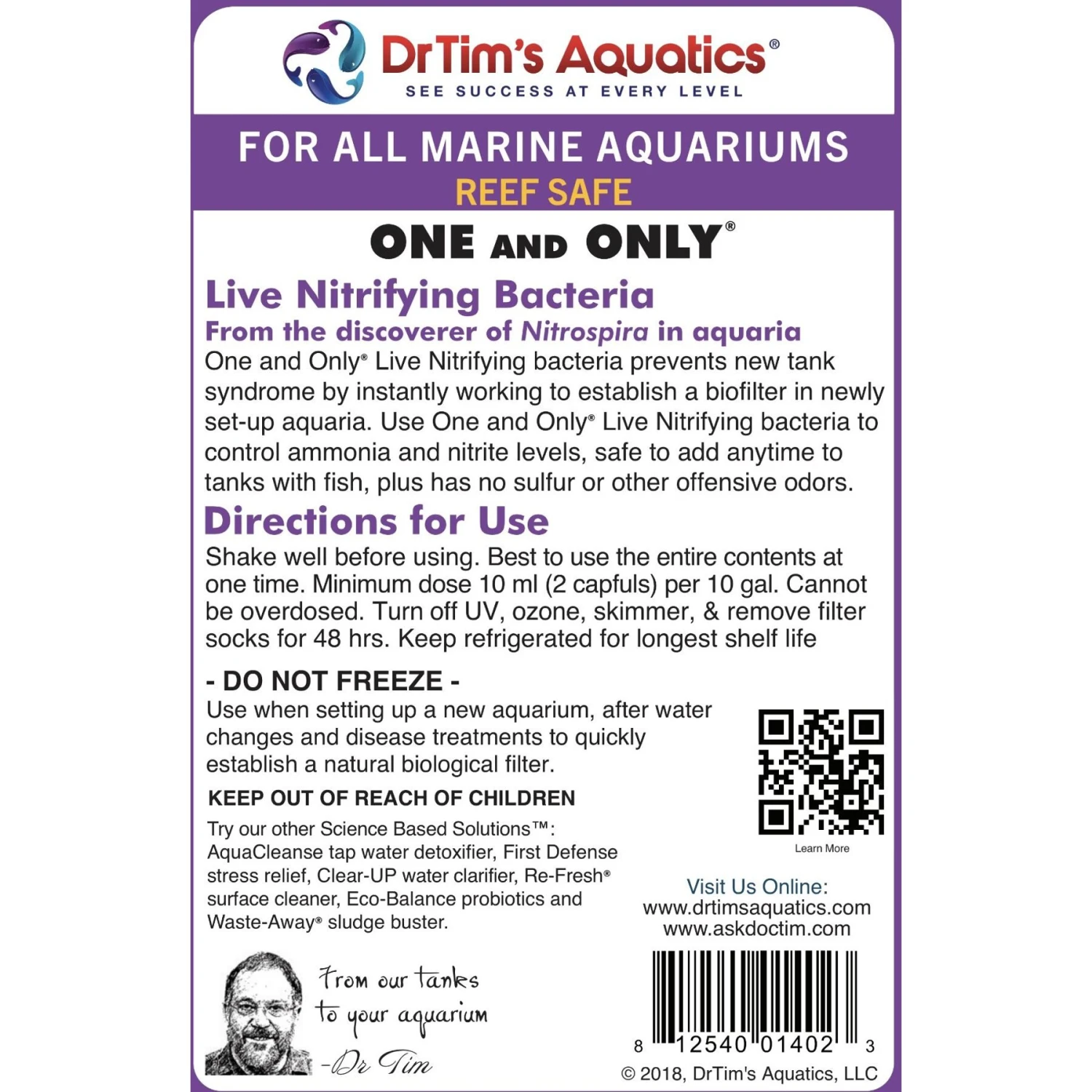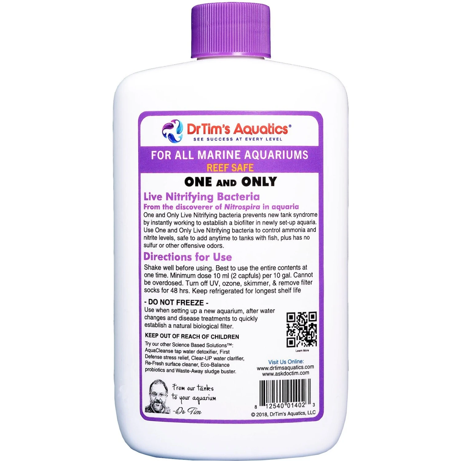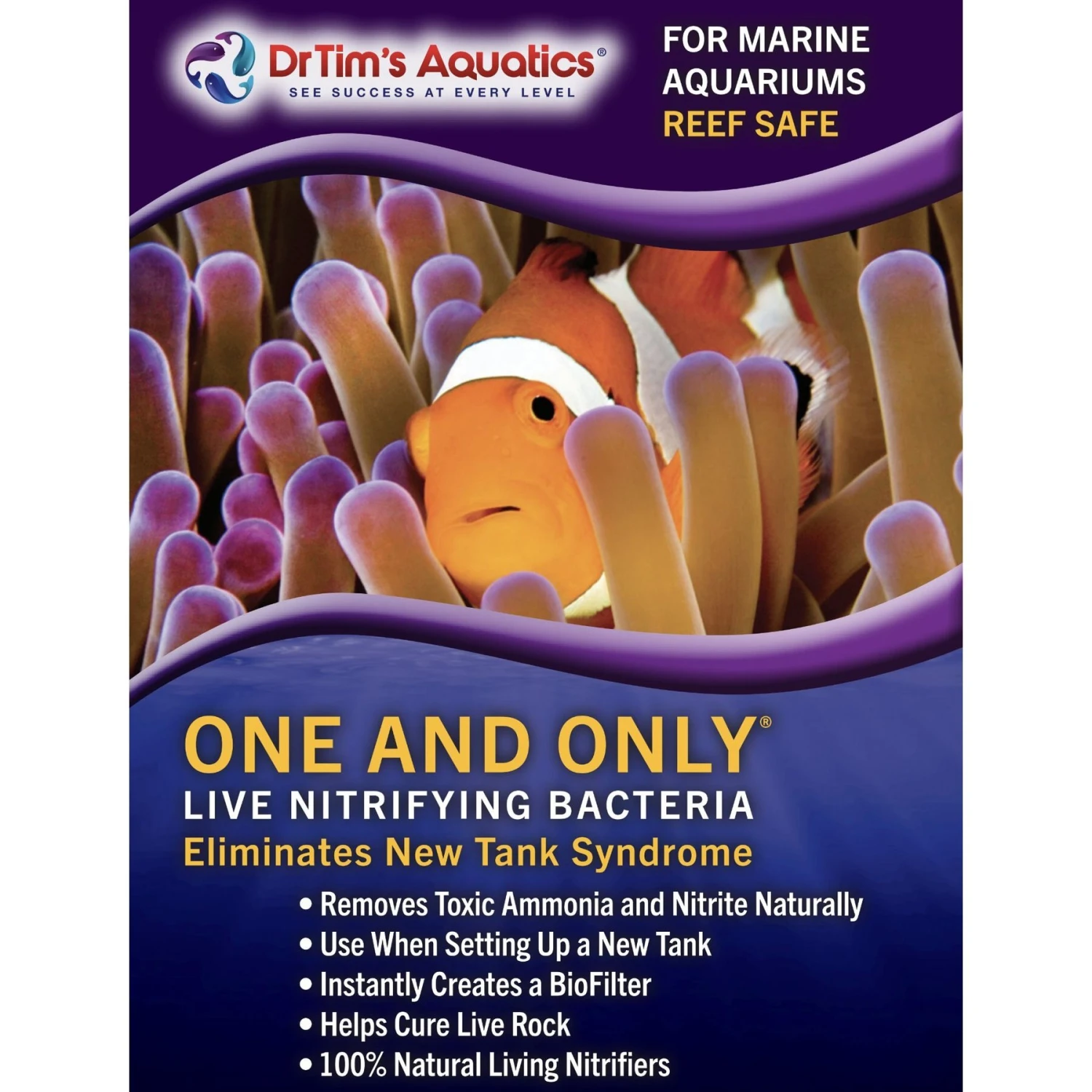 Dr. Tim’s Aquatics One & Only Live Nitrifying Bacteria for Reef Aquariums removes toxic ammonia and nitrite, instantly working to prevent new tank syndrome by establishing a biological filter in your newly set up aquarium. Use One & Only when setting up a new tank, after a disease treatment, or during water changes. This powerful solution contains no sulfur or other offensive odors.