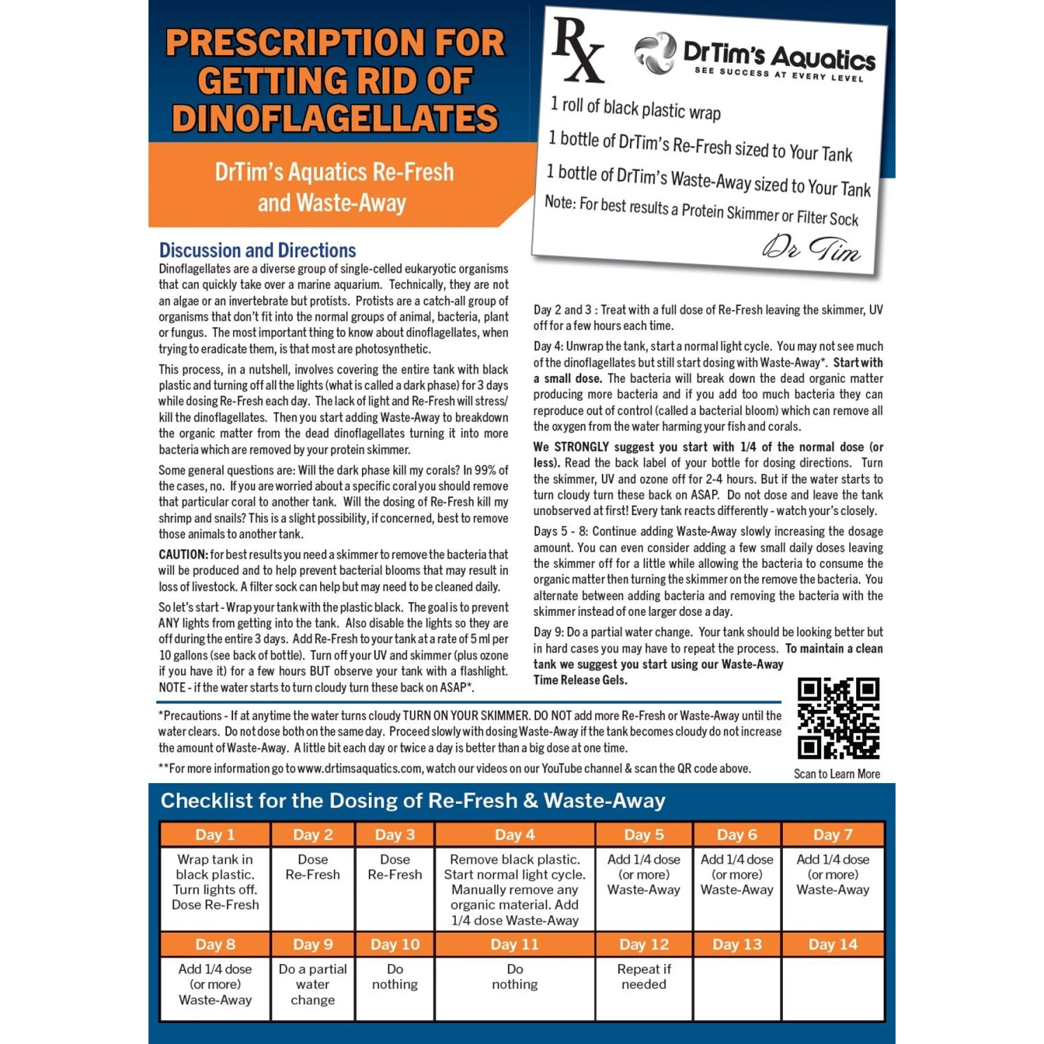 Shake well before using. Maximum dose 5ml (1 capful) per 10 gallons of water. Re-FRESH should be added on a weekly basis to help maintain a clear, clean and sparkling aquarium. For best results turn skimmer & UV off for 8-12 hours after dosing. Do not add other water conditioners on the same Re-Fresh.