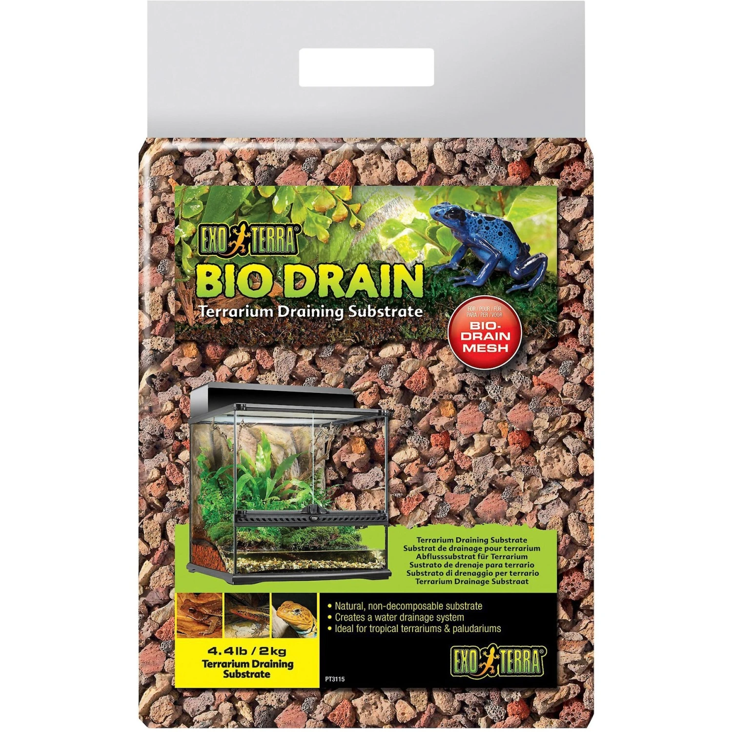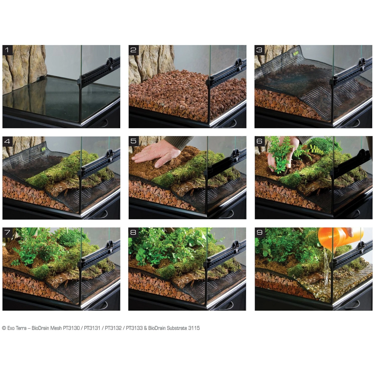 Create decorative water drainage systems without contamination from decorative substrate particles with the Exo Terra Bio Drain Terrarium Draining Reptile Substrate. The Exo Terra BioDrain Terrarium Draining Mesh is part of the BioDrain Terrarium Draining System. This non-toxic mesh keeps the underlying draining substrate separate from the decorative terrarium top-layer substrate which allows proper water drainage and prevents contamination. It is ideal for creating water areas and biological filtration systems. Exo Terra Terrarium Moss, Jungle Earth or Plantation Soil can be used as decorative substrates.