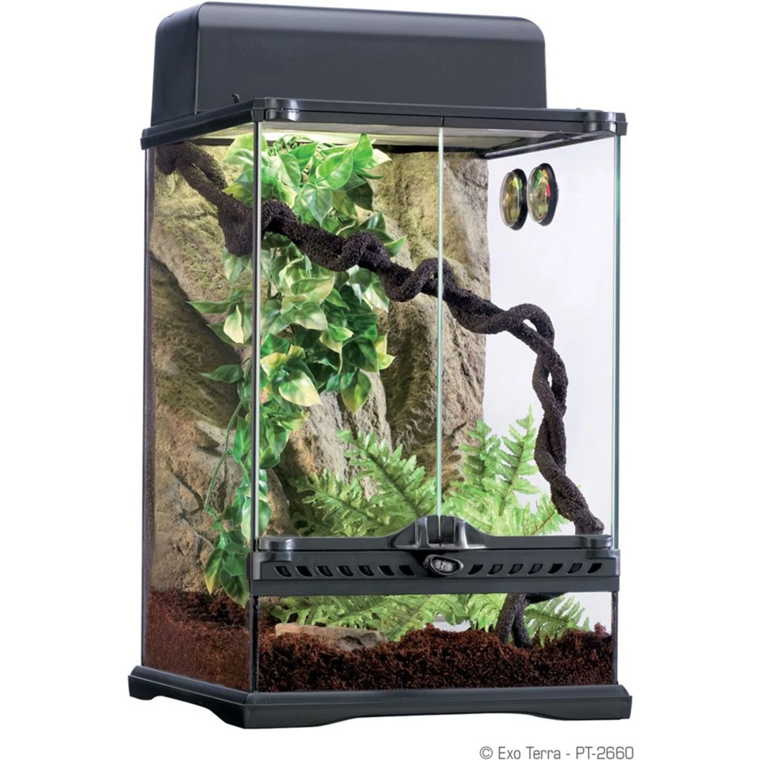 - Features a full glass terrarium crafted with dual front doors for easy but escape-free access.