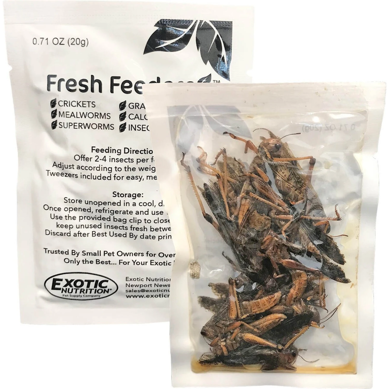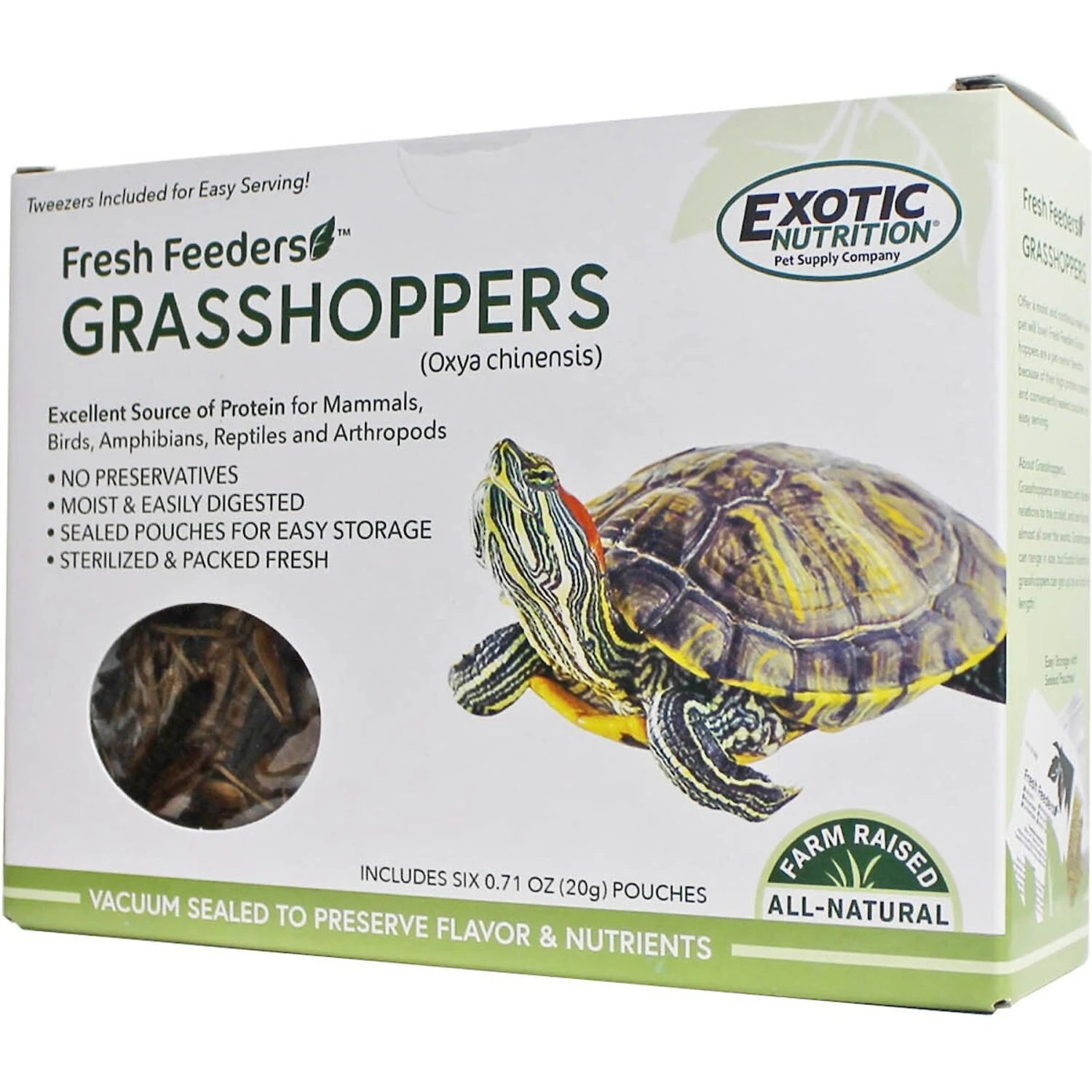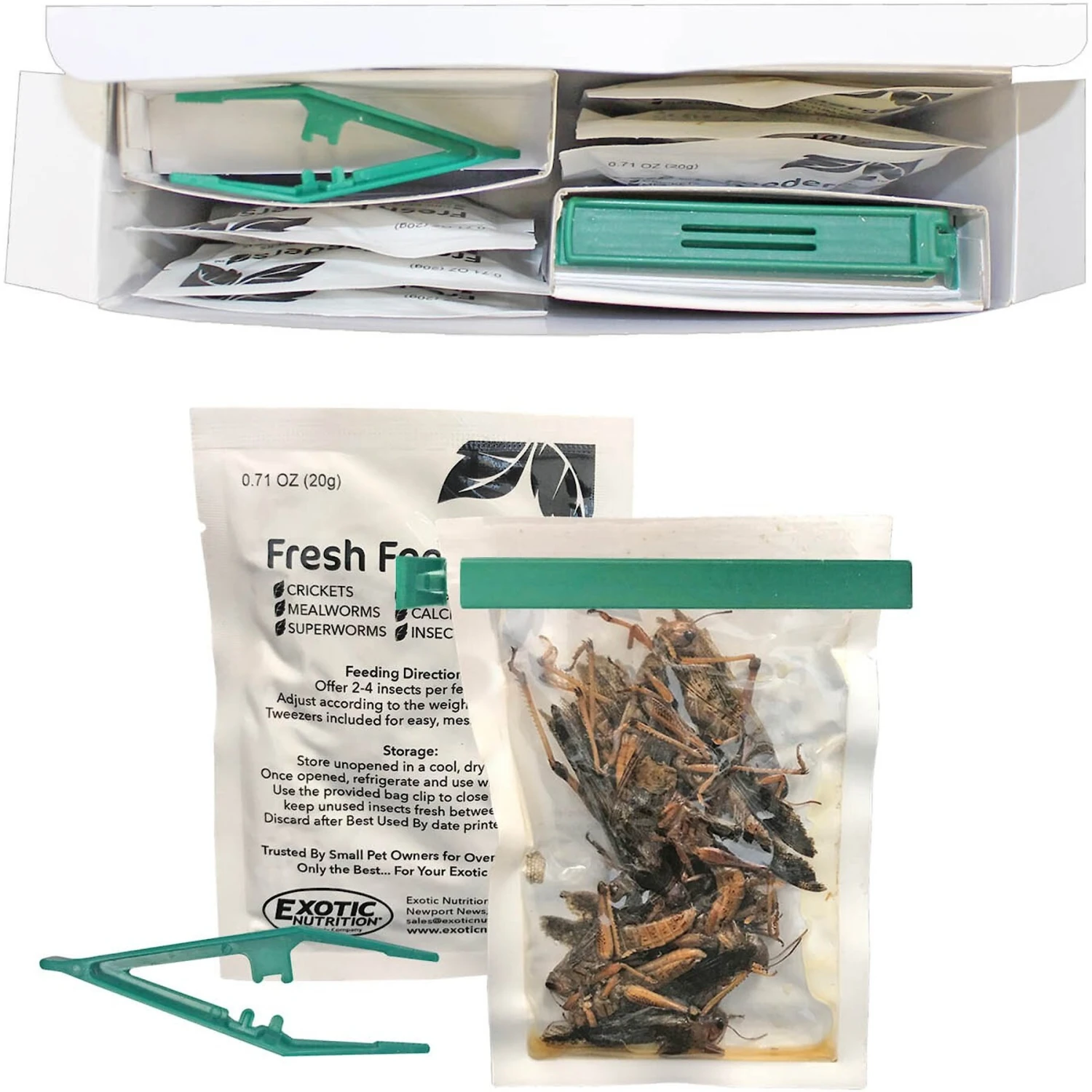 Treat your buddy to a snack that packs plenty of flavor and nutrition with Exotic Nutrition Fresh Feeders Grasshoppers Small Animal Treats. These all-natural treats make a great supplemental meal source for amphibians, hedgehogs, reptiles, sugar gliders, tropical fish, turtles and other insect-eating critters. They’re made with farm-raised grasshoppers that are carefully cooked to maintain nutrition and moisture for easy digestion. Plus, each box comes with feeding tweezers for easy, ick-free servings. This is also great for use with aquatic turtles, terrestrial turtles, aquatic amphibians, terrestrial amphibians, invertebrates, and lizards.