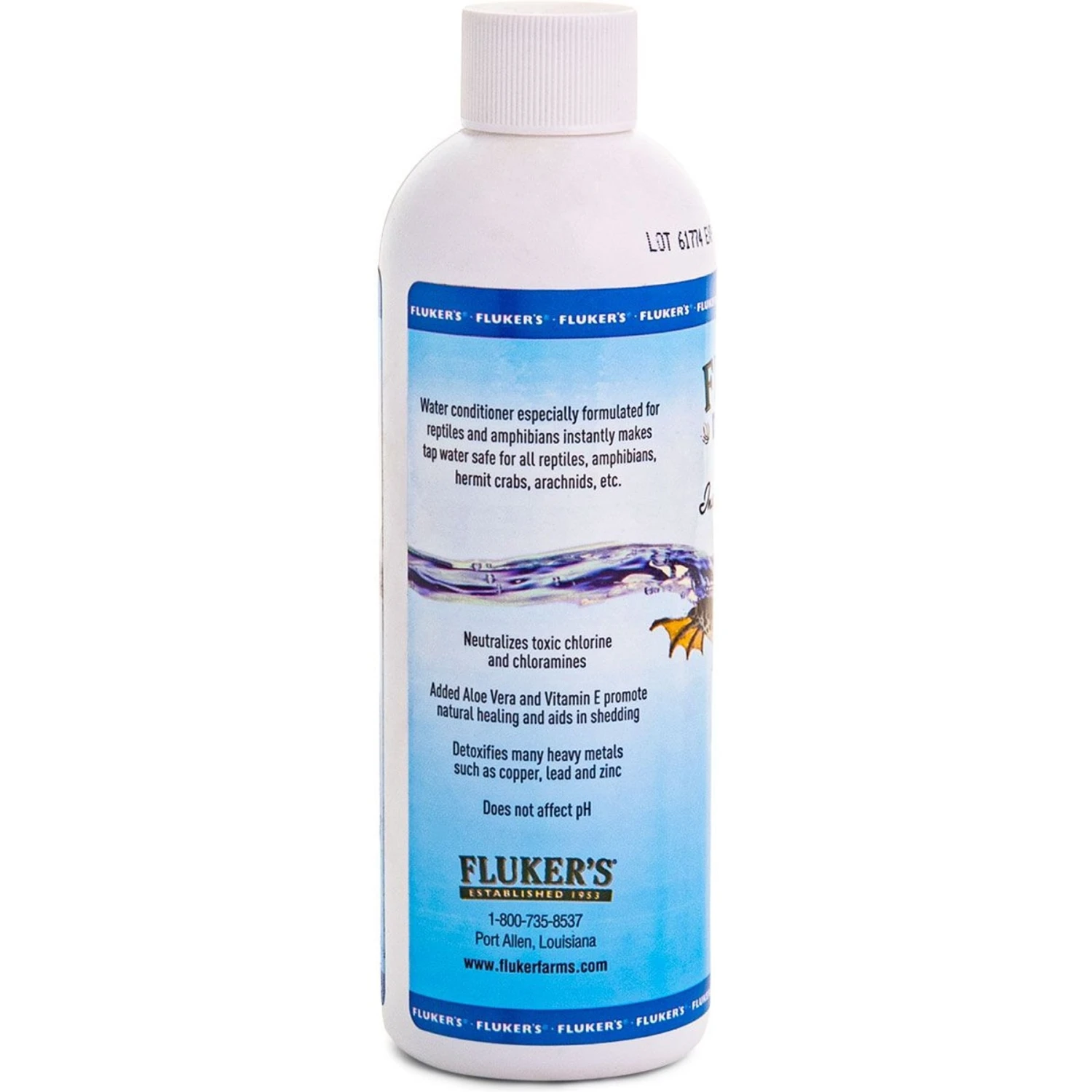 Keep your aquatic pets healthy and safe with Fluker’s Dechlorinator with Aloe Reptile Water Conditioner! Created to instantly make tap water safe for all your aqua-loving pets, this specially formulated solution neutralizes toxic chlorine and chloramines. It also detoxifies heavy metals, including copper, lead and zinc that can contribute to health issues in your aquatic pets such as your reptile, amphibian, hermit crab, arachnid and many more. Crafted with aloe vera and vitamin E, this water conditioner promotes natural healing and works as a shedding aid without affecting the pH balance of your pet’s water. One bottle can easily treat up to 470 gallons of water. This is also great for use with aquatic turtles, terrestrial turtles, aquatic amphibians, and terrestrial amphibians.