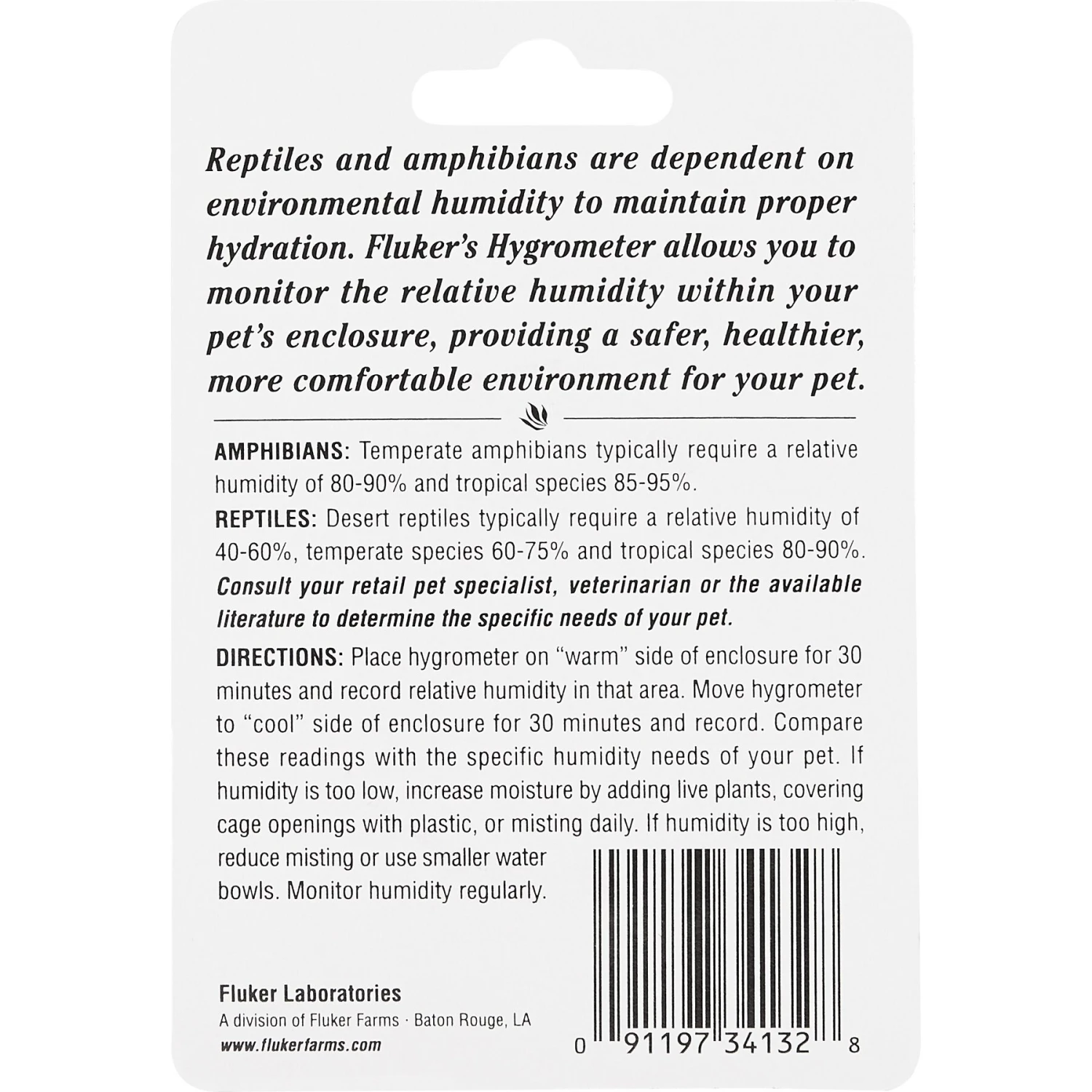 Fluker’s Relative Humidity Hygrometer brings a splash of style and function to your reptile or amphibian’s terrarium. It measures relative humidity of your pet’s habitat to help you maintain a consistent level of humidity, ensuring he remains comfortable and healthy. This is also great for use with aquatic turtles, terrestrial turtles, tortoises, aquatic amphibians, terrestrial amphibians, invertebrates, lizards, and snakes.