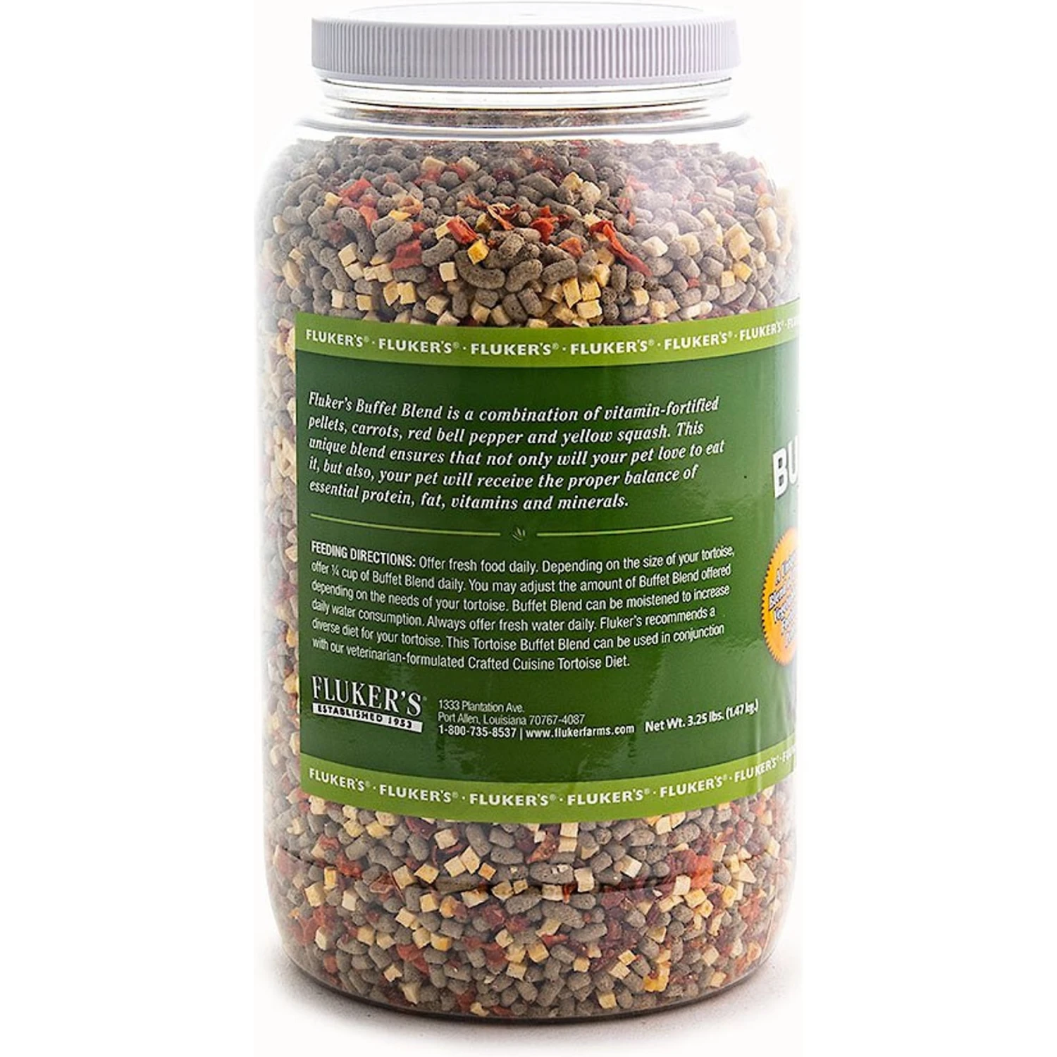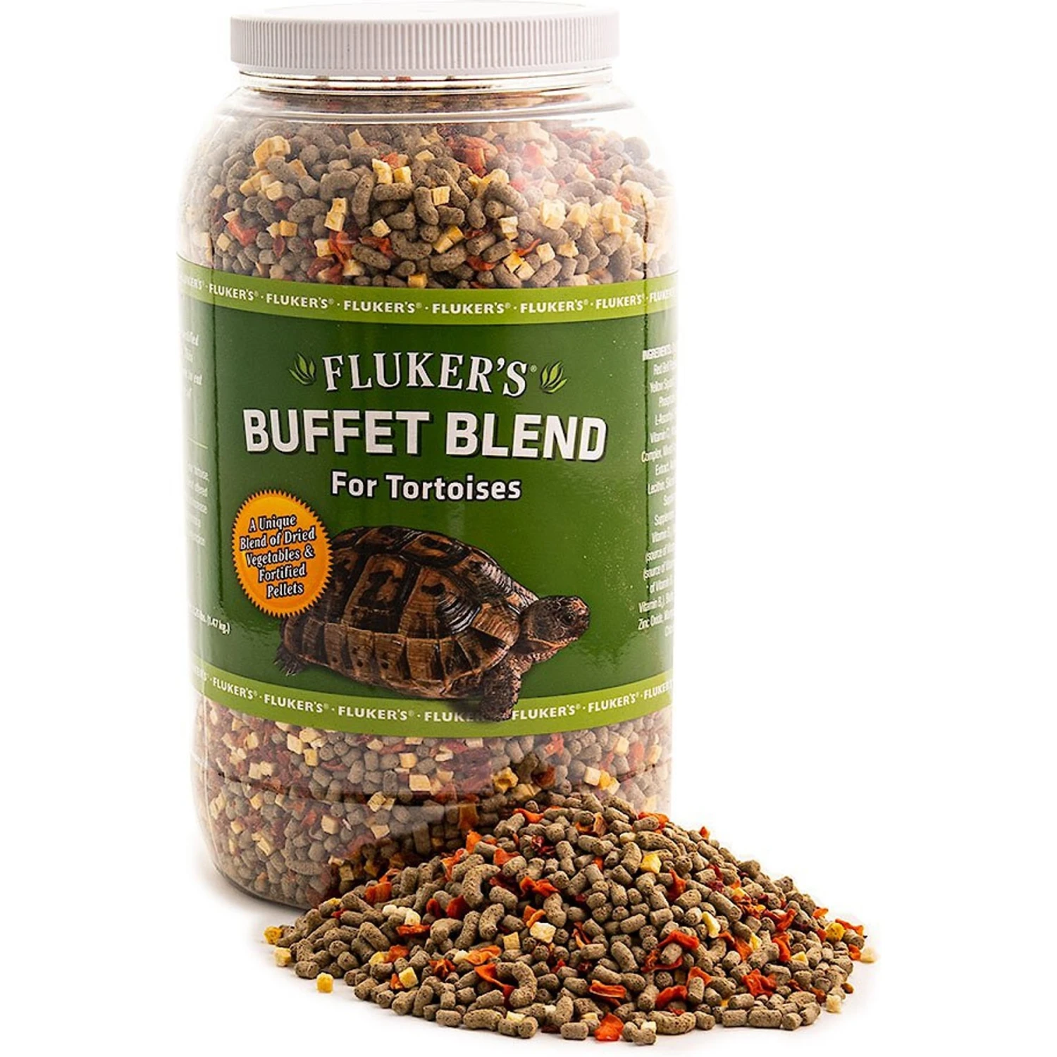 We all know it’s important to eat your veggies. That’s why Fluker’s Tortoise Buffet Blend Reptile Food is packed with freeze-dried yellow squash, dried red bell pepper, and dried carrots—plus vitamin-enriched pellets to provide a complete and balanced meal. This food provides all of the essential vitamins and nutrients your tortoise needs, all wrapped up in tasty nutritional variety that they love. This is also great for use with tortoises and terrestrial turtles.