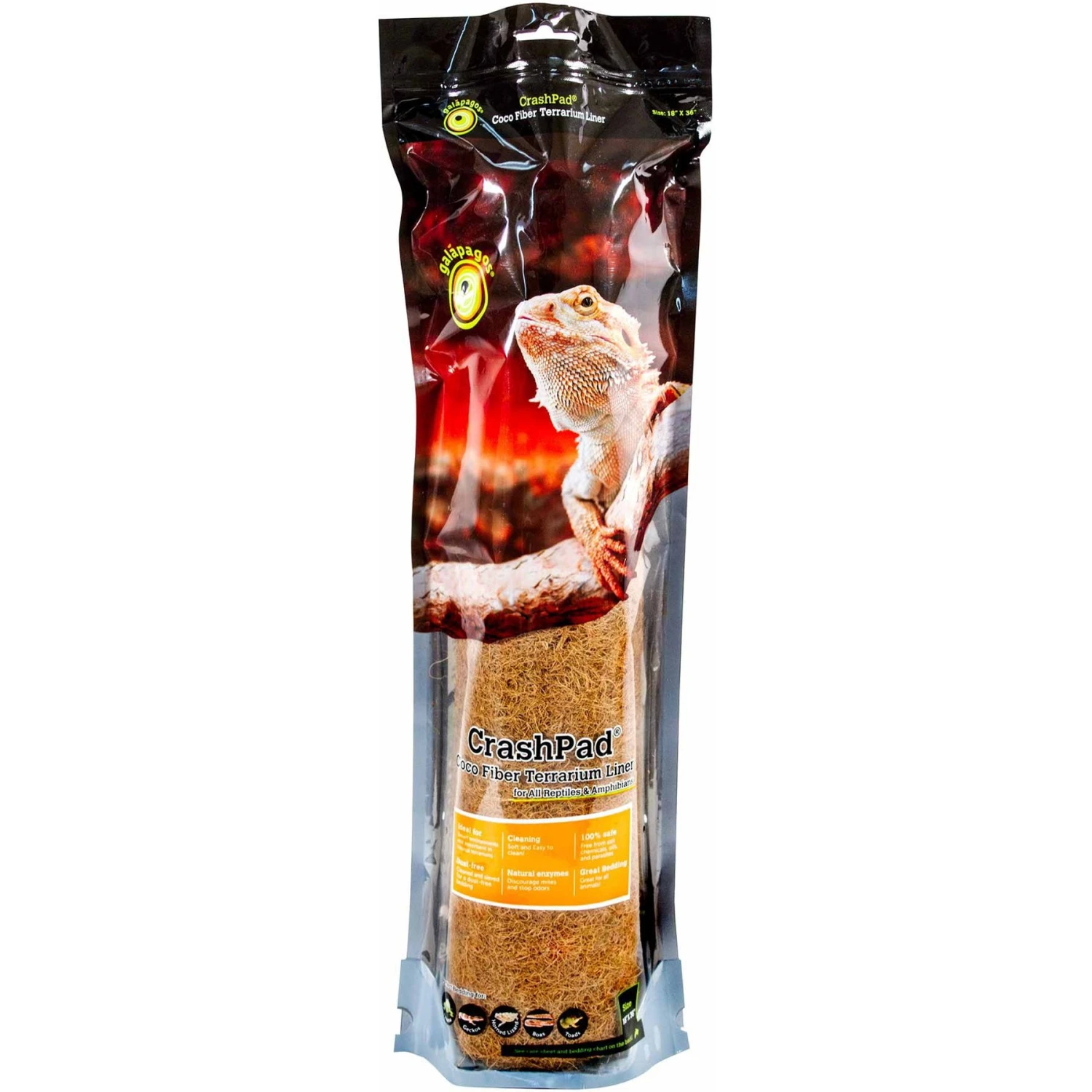 Protect your terrarium and your pets with the Galapagos Coco Fiber Crash Pad Terrarium Bedding. A combination of durable plastic netting and coconut fiber, this substrate is easy to clean and a perfect addition to any tank. Whether you have an iguana, bearded dragon, horned lizard, boa, toad or other species, this crash pad will enhance your terrarium setup and make your pet feel right at home. Comes in a resealable bag to preserve freshness. This is also great for use with tortoises, terrestrial turtles, aquatic amphibians, terrestrial amphibians, invertebrates, lizards, and snakes.