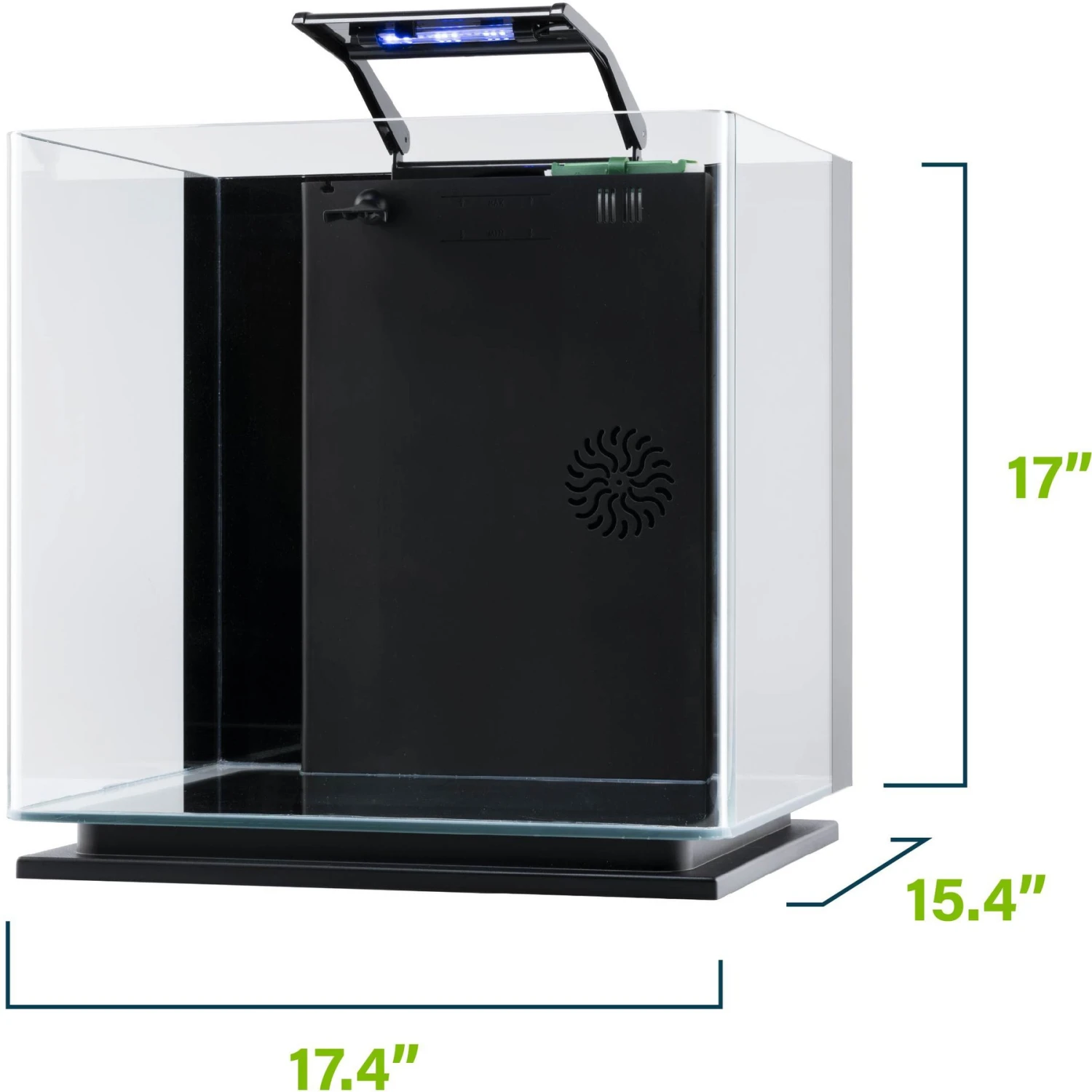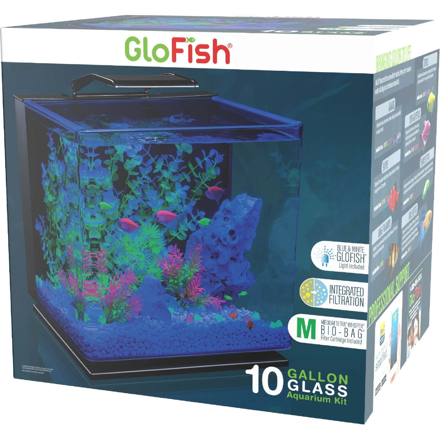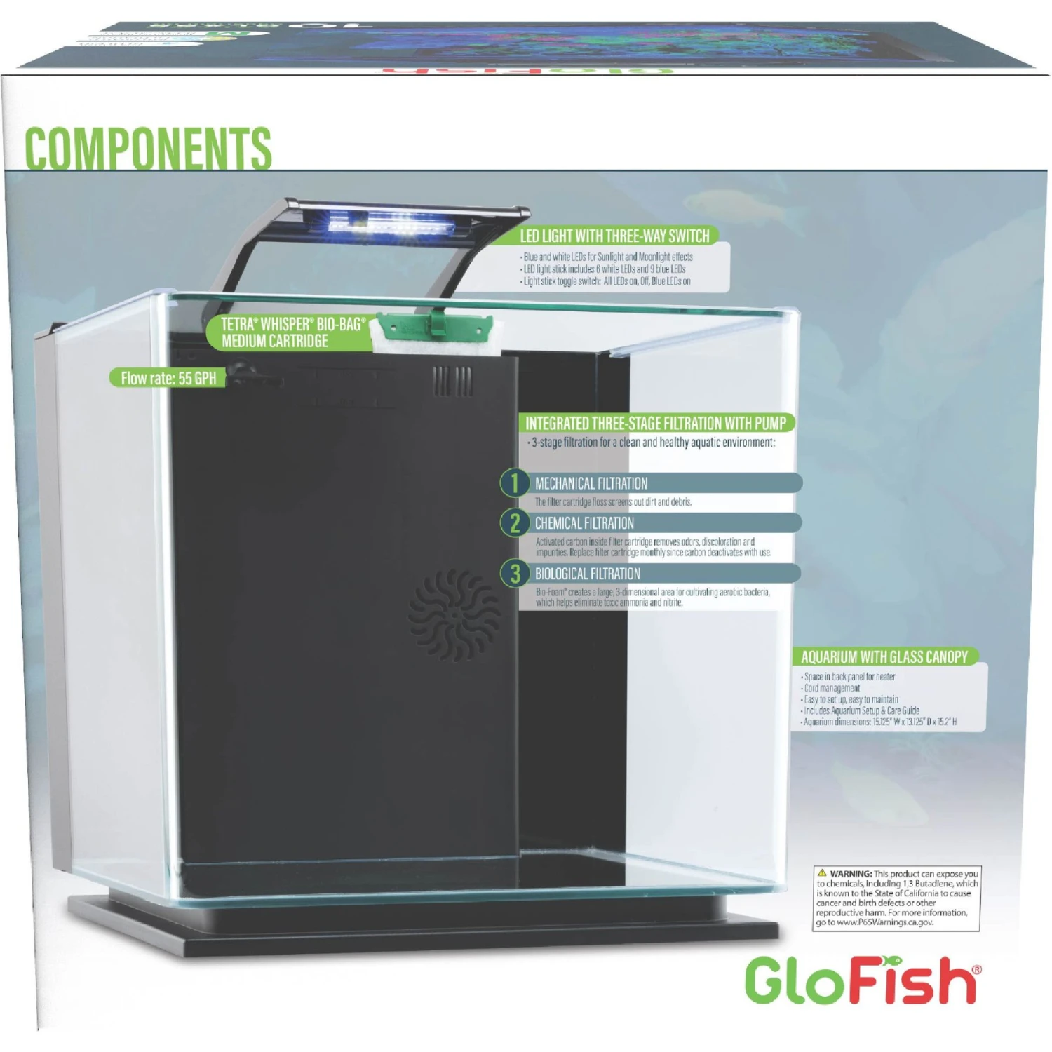 Welcome your new finned friend home with the GloFish Glass Aquarium Kit! This starter kit features a 10-gallon aquarium with a glass canopy, LED lights with a three-way switch plus an integrated, three-stage filtration system with cartridge. With the LED light toggle switch, you can choose between Sunlight Mode—with blue and white LED lights for vivid colors that look great with any décor and fish—and Moonlight Mode, with blue LED lights that make GloFish-brand decor and fish (each sold separately) fluoresce even more brilliantly. This aquarium is easy to set up and keep clean. The integrated three-stage filtration includes a combination of mechanical, chemical and biological filtration for a clear and healthy aquatic environment for your fish. Combine with GloFish plants and decor (sold separately) to transform your aquarium into an enchanting underwater world!