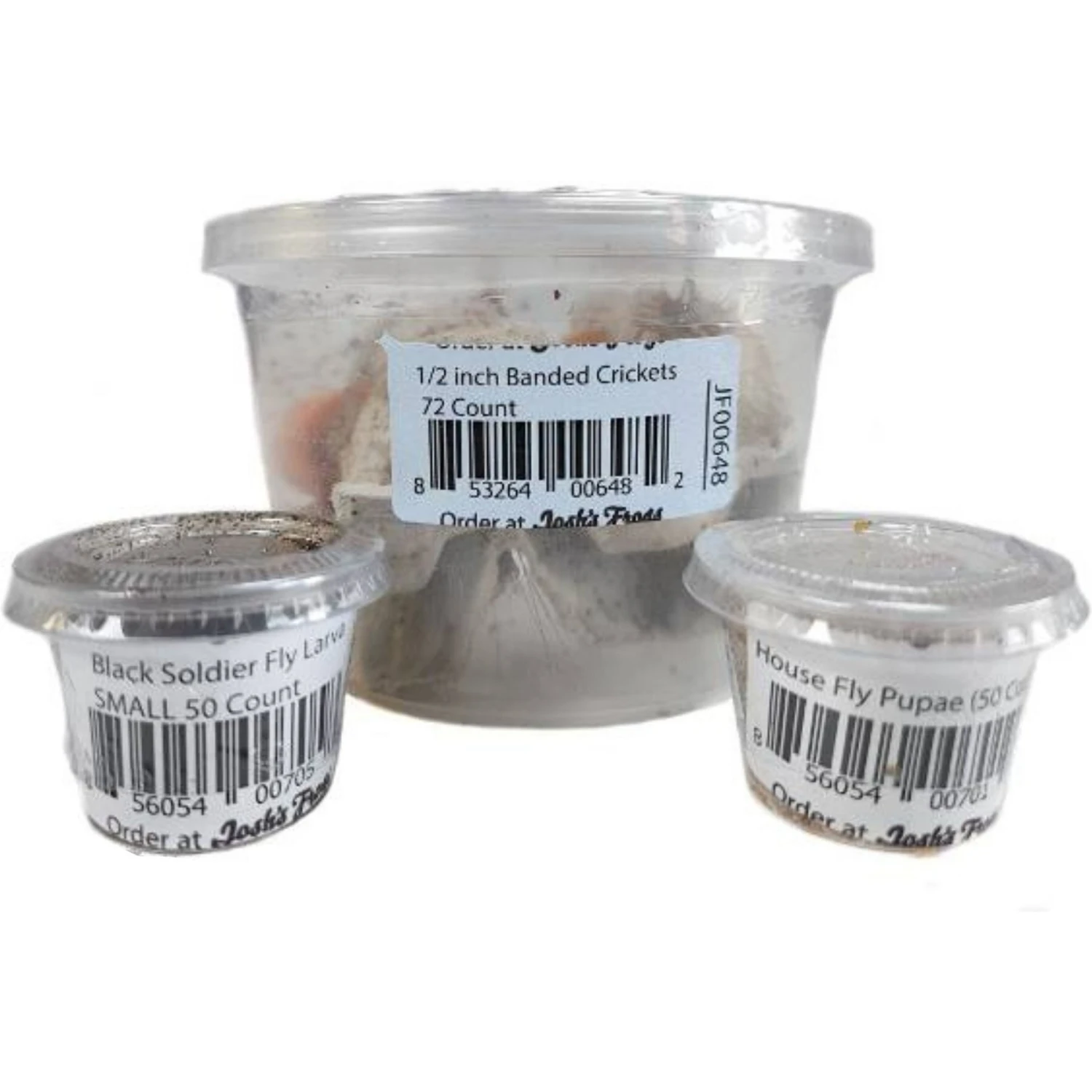 Give your froggy friend a nutritious and rewarding hunting experience with Josh’s Frogs Juvenile Tree Frog Feeder! This feeder bundle is designed to keep your medium or juvenile tree frog fed and happy for up to two weeks. Each order comes with 1/2-inch banded crickets, black soldier fly larvae and house fly pupae. These insects are great for routine feeding as well as treating. And best of all, this bundle is specially packaged to help ensure a live arrival in most weather conditions. Treat your pal to the fresh, nutritious insects they crave with Josh’s Frogs! This is also great for use with terrestrial amphibians.