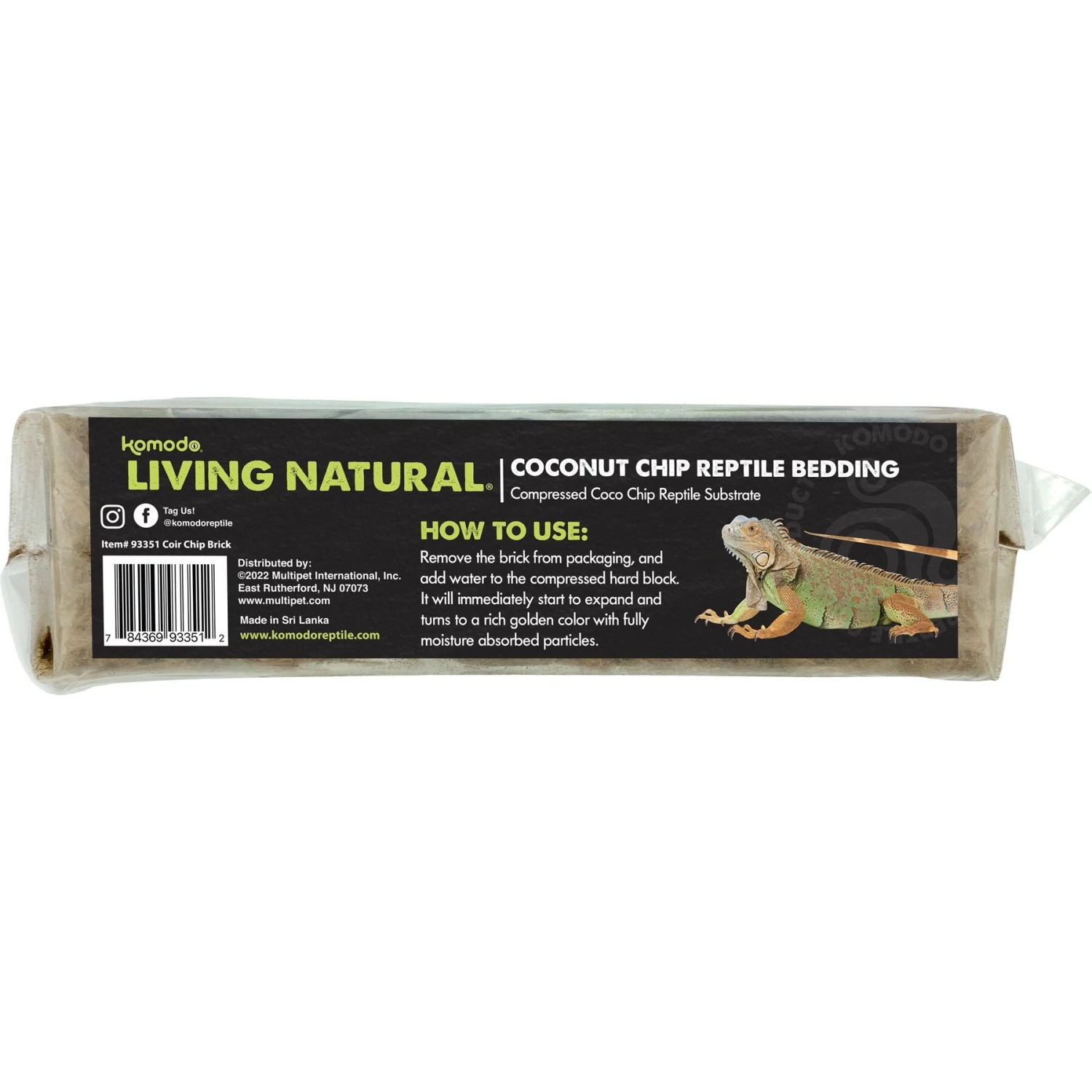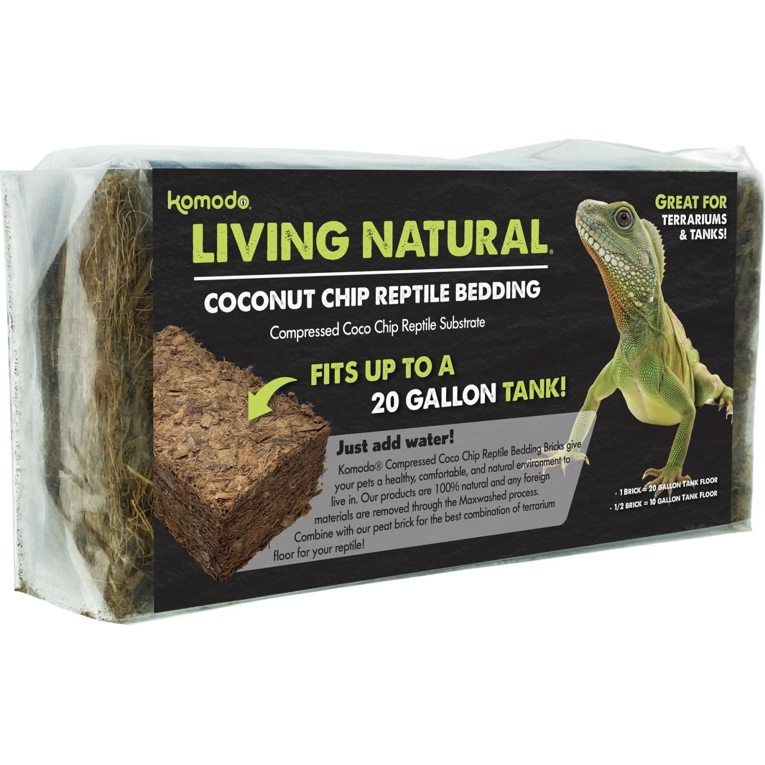 Create a natural, comfy environment for your reptile with Komodo Coir Chip Brick Single Reptile Bedding! This bedding brick is made from coconut coir chips that help retain moisture for a cozy, humid terrarium. The chips go through a rigorous washing process to help remove any foreign materials. This bedding is great for reptiles who like to dig or require a moist environment. Watch as it stimulates their natural urge to burrow! This is also great for use with tortoises, terrestrial turtles, invertebrates, lizards, and snakes.