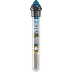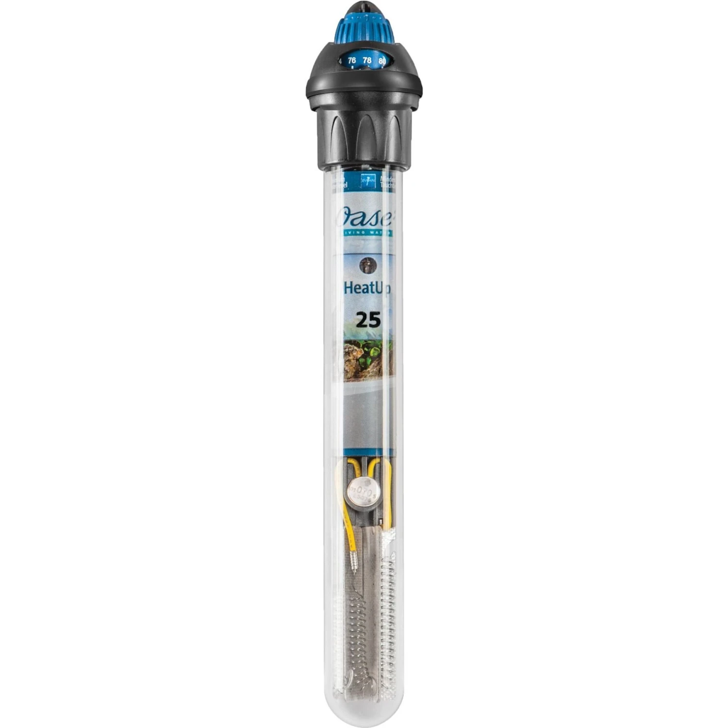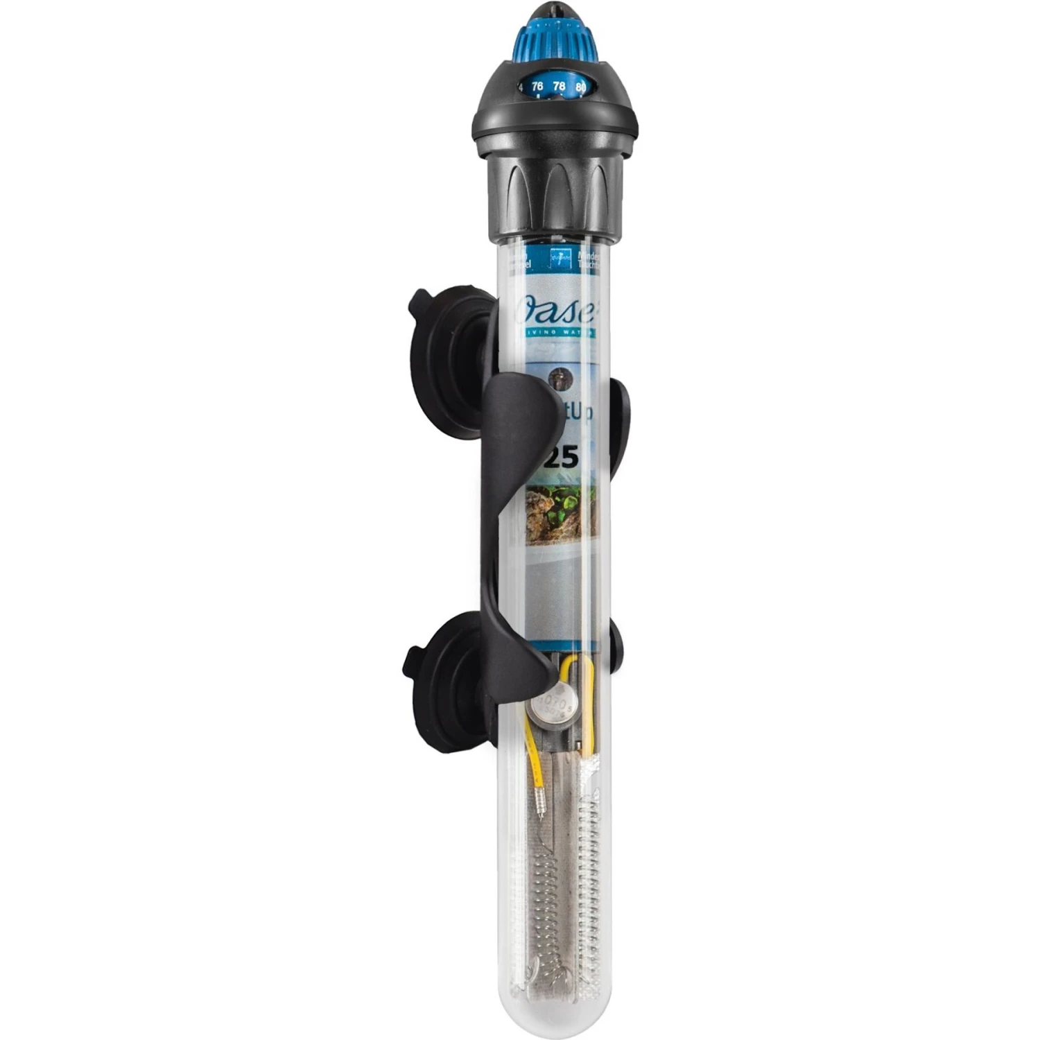 The OASE Indoor Aquatics HeatUp 25 Adjustable Fish Heater makes it easy to keep your aquarium at the perfect temperature. You can adjust the temperature scale from 66 to 90 degrees Fahrenheit, and a secondary knob control allows for precise temperature adjustment within two degrees. Bi-metal technology automatically monitors and controls temperature levels, and a thermal shutoff switch adds extra protection. An activated control light lets you easily see when the unit is heating. The heater is energy efficient, too, to help keep your electricity usage down. The included holder and suction cups make it easy to install the heater on the side of your fresh or marine water aquarium.