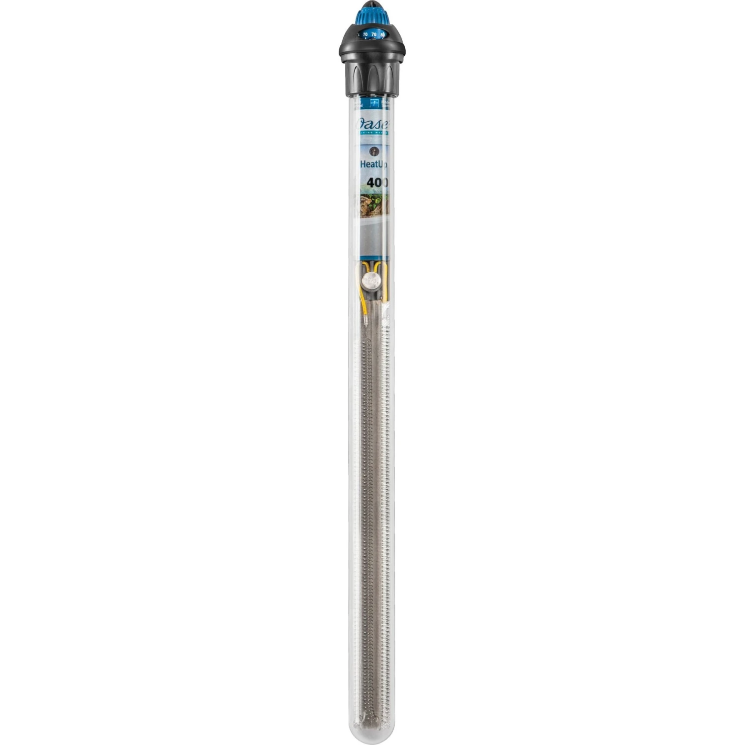 The OASE Indoor Aquatics HeatUp 400 Adjustable Fish Heater makes it easy to keep your aquarium at the perfect temperature. You can adjust the temperature scale from 66 to 90 degrees Fahrenheit, and a secondary knob control allows for precise temperature adjustment within two degrees. Bi-metal technology automatically monitors and controls temperature levels, and a thermal shutoff switch adds extra protection. An activated control light lets you easily see when the unit is heating. The heater is energy efficient, too, to help keep your electricity usage down. The included holder and suction cups make it easy to install the heater on the side of your fresh or marine water aquarium.