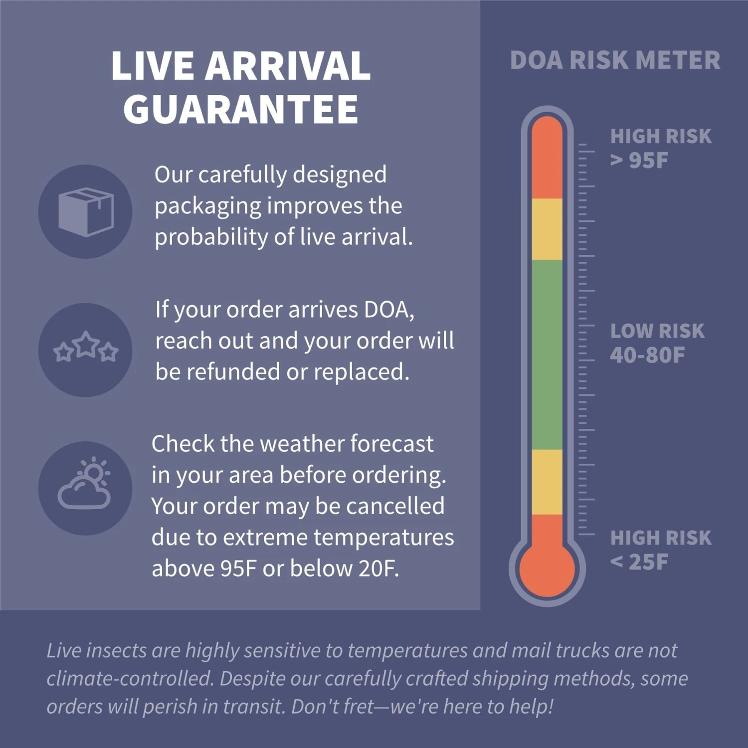 Extreme weather conditions are the #1 cause of shipments dying in transit. Temperatures below 20F and above 95F can be deadly, even with our carefully developed shipping standards. Please take a look at the temperature forecasts for your shipping destination for the delivery date range before placing an order. If temperatures at the shipping destination are out of this range, there is a significant chance your order may not arrive live. Please keep in mind that our insects are a natural product. Some amount of variation is normal and expected. All sizes are sold as an average and there will always be some that are larger or smaller than the average in an order.