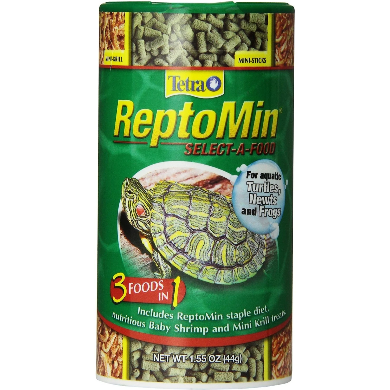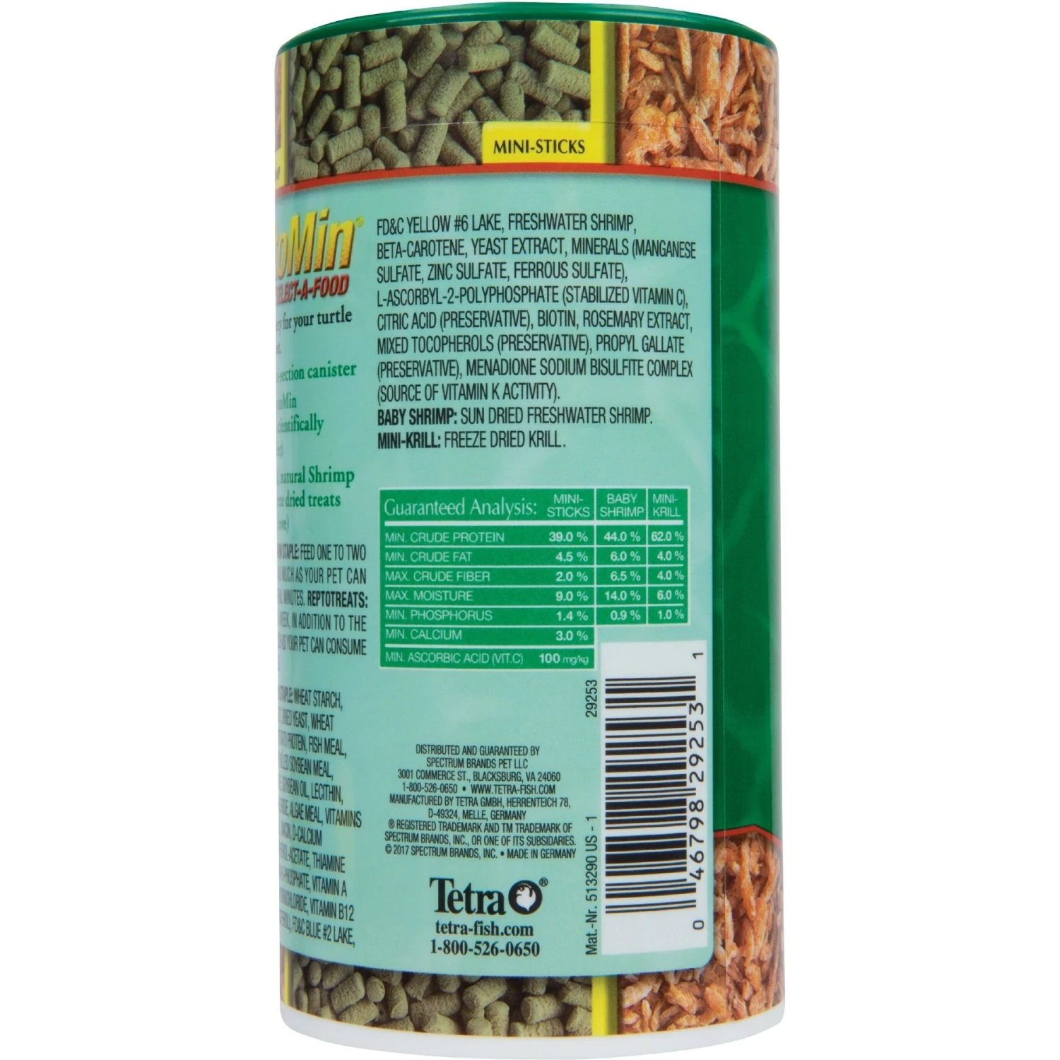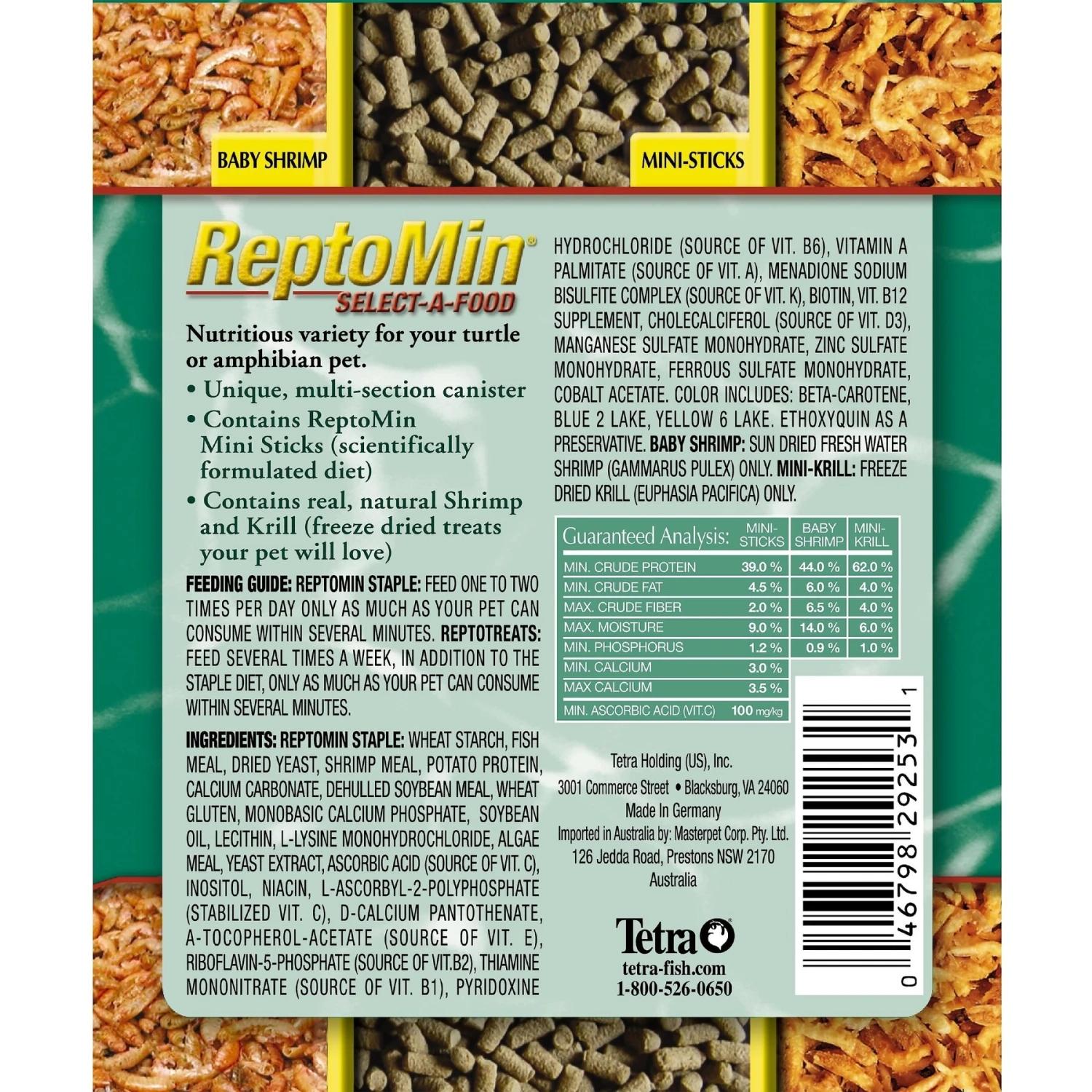 Add variety to your reptile’s diet with Tetra ReptoMin Select-A-Food 3 in 1 Mini-Sticks Turtle, Newt & Frog Food. Reptiles love variety and adding different food to their staple diet encourages natural foraging behaviors. Tetra ReptoMin Select-A-Food 3 in 1 Mini-Sticks Turtle, Newt & Frog Food offers this variety with three different foods in one canister. It contains ReptoMin Sticks as staple diet, real natural shrimp treats and freeze-dried krill treats. Use the convenient multi-section lid selector to feed your reptile the food of your choice.