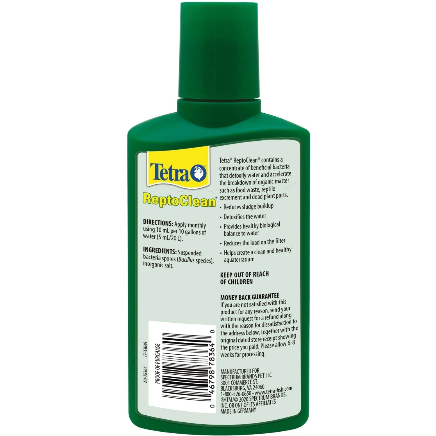 - Tetra ReptoClean solution contains a concentrate of beneficial bacteria that helps accelerate the breakdown of organic matter such as food waste, reptile excrement and dead plant parts.