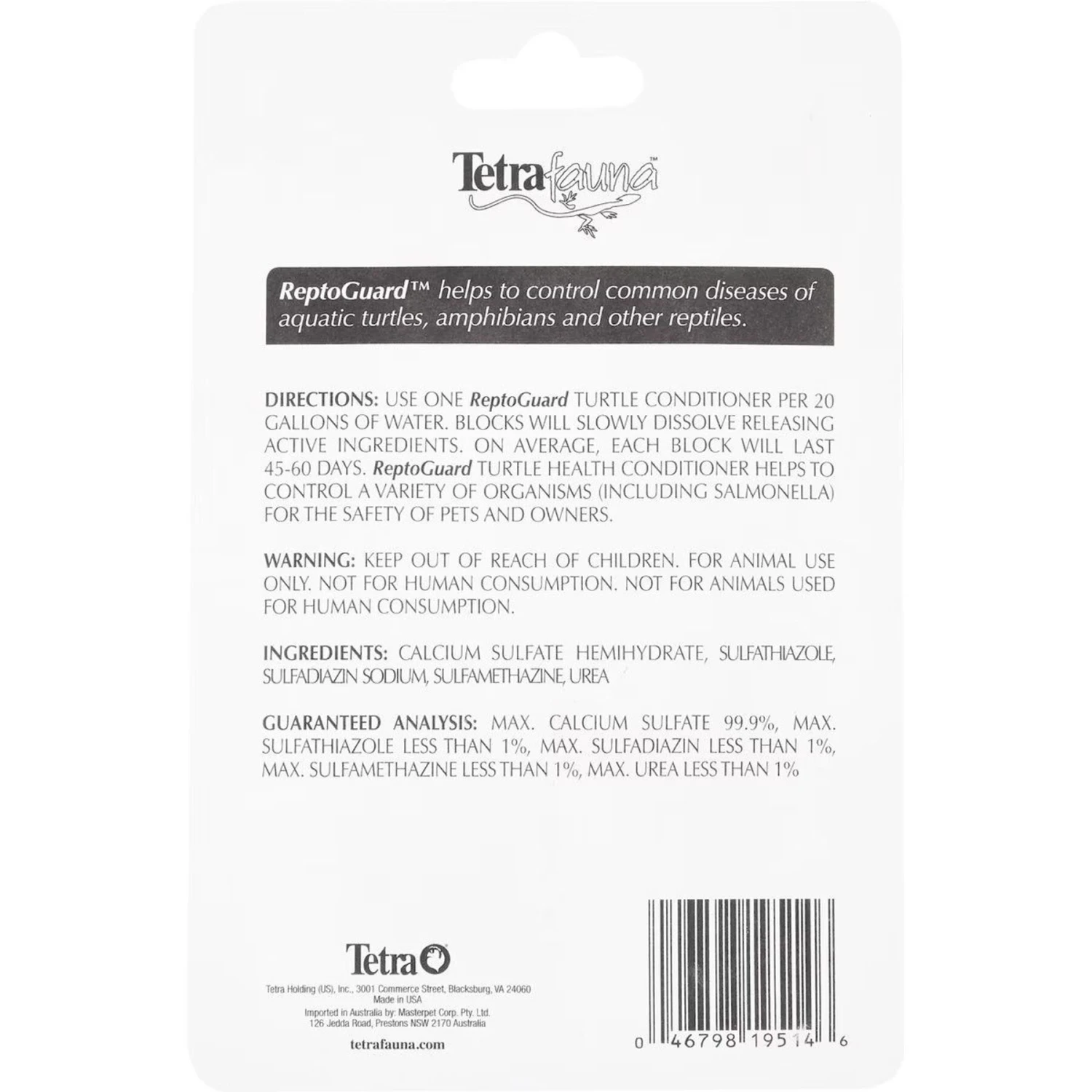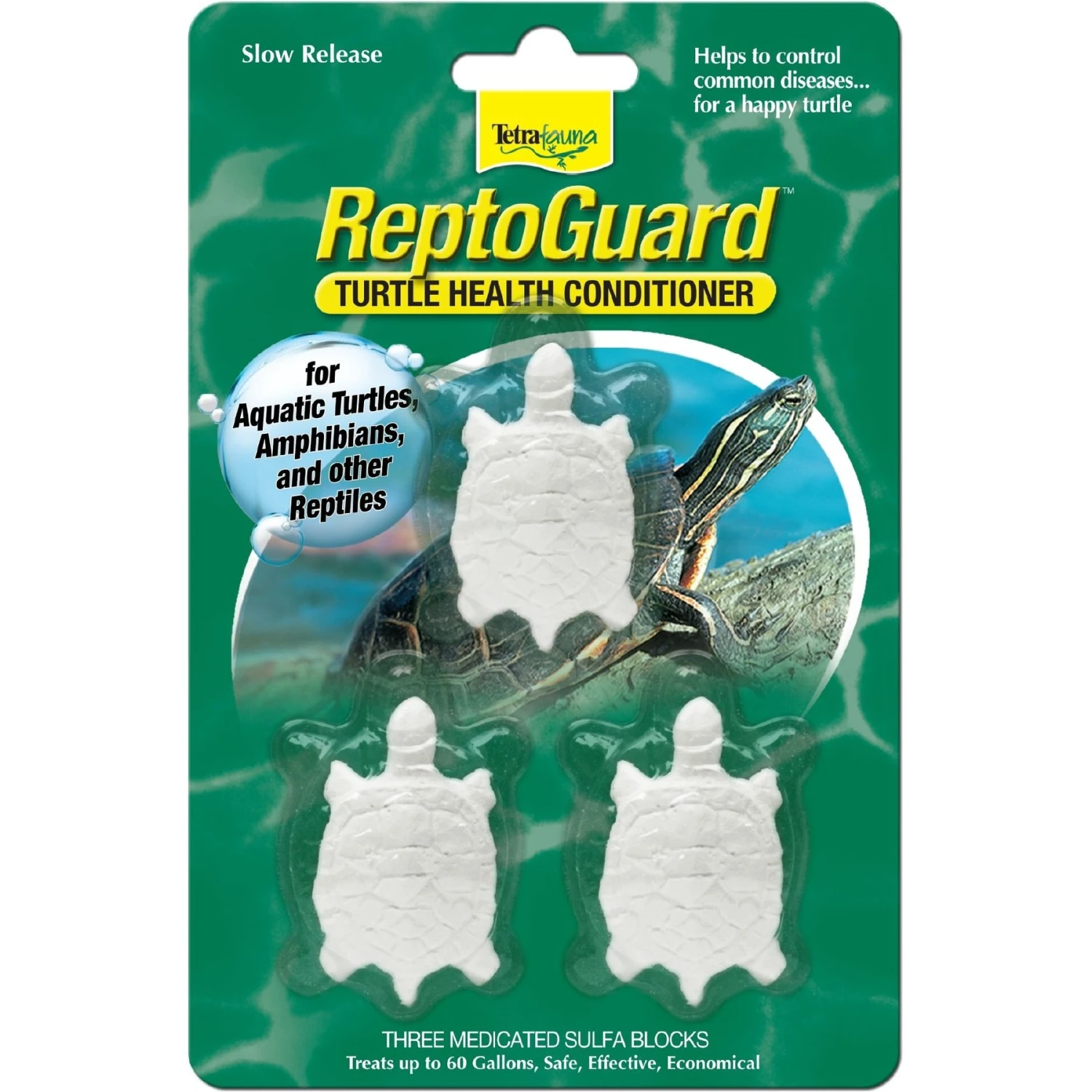 Prevent the spread of salmonella from your turtle with Tetrafauna ReptoGaurd Turtle Health Water Conditioner. Turtles and other reptiles can carry salmonella bacteria on their outer skin and shell. It can be transmitted to humans through contact and make them very ill. Tetrafauna ReptoGaurd Turtle Health Water Conditioner is a slow-release, medicated sulfa block that controls salmonella and other disease-causing bacteria. Just place the turtle-shaped cake in your aquarium to treat your water.