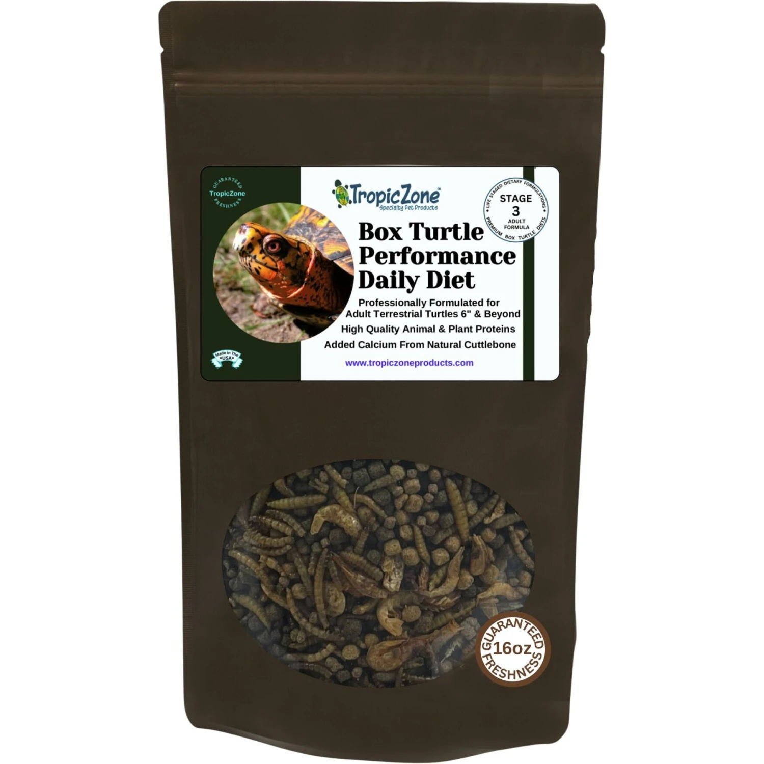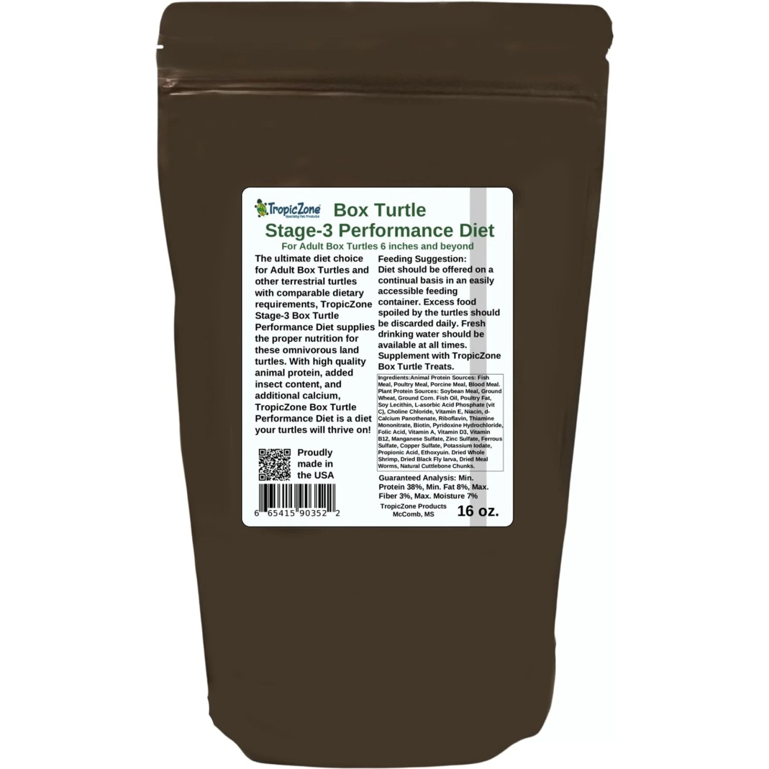 TropicZone Box Turtle Performance Daily Diet Stage 3 for Adult Turtles Food is the perfect food for your adult box turtle! This specially formulated diet is designed to meet the specific needs of adult box turtles 6” and beyond. It contains high-quality animal and plant proteins, tasty nutritious insects, shrimp, and added calcium from natural cuttlebone. Plus, there are no artificial colorants or flavorings, so you can be assured that your little buddy is getting the best nutrition possible.