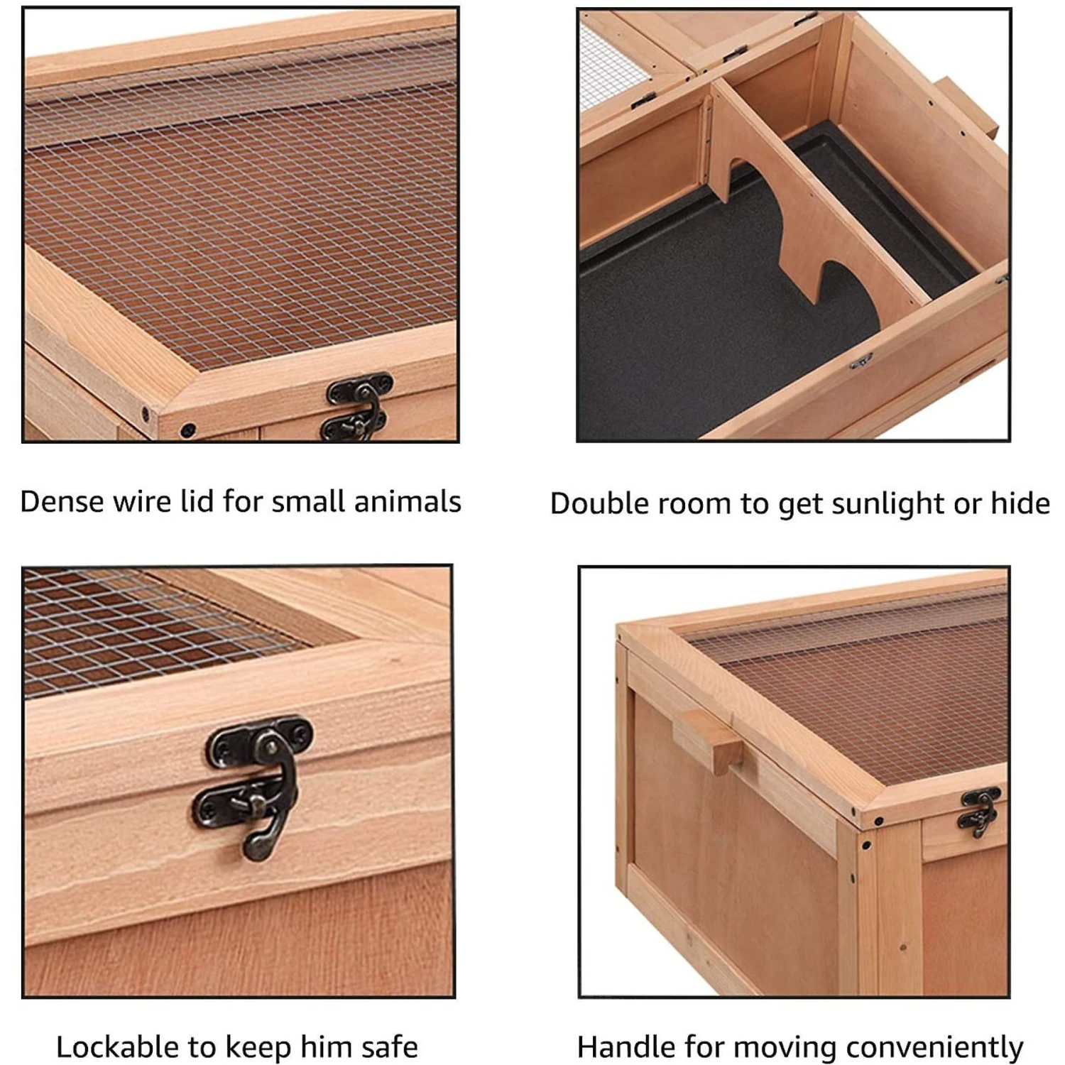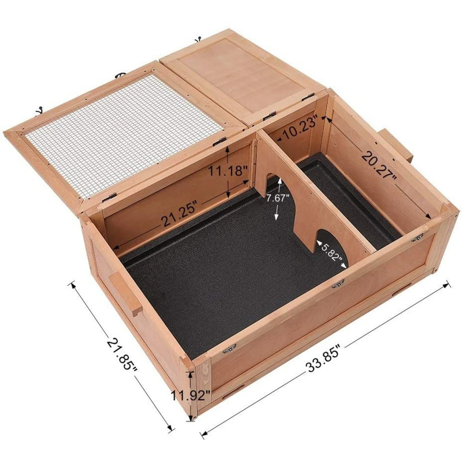 - The house has two rooms, one completely enclosed for a great place to hide or sleep—and the other with a grated wire top so your pal can get some sun and heat.