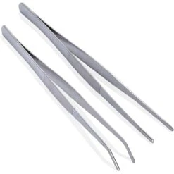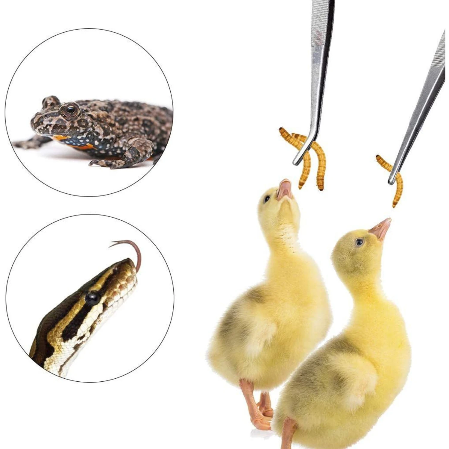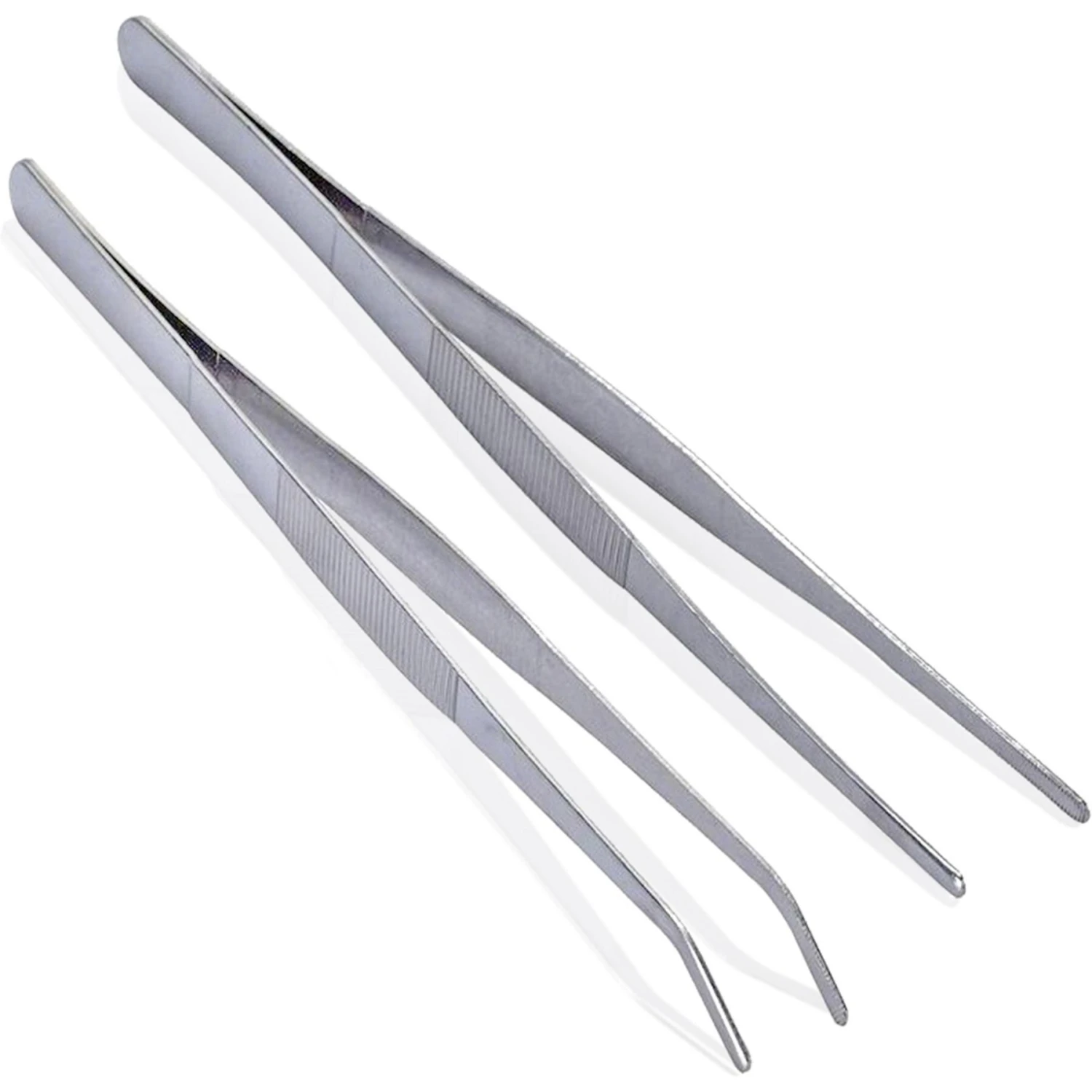 - Two reptile feeding tweezers—one straight and one curved—made of medical grade stainless steel.