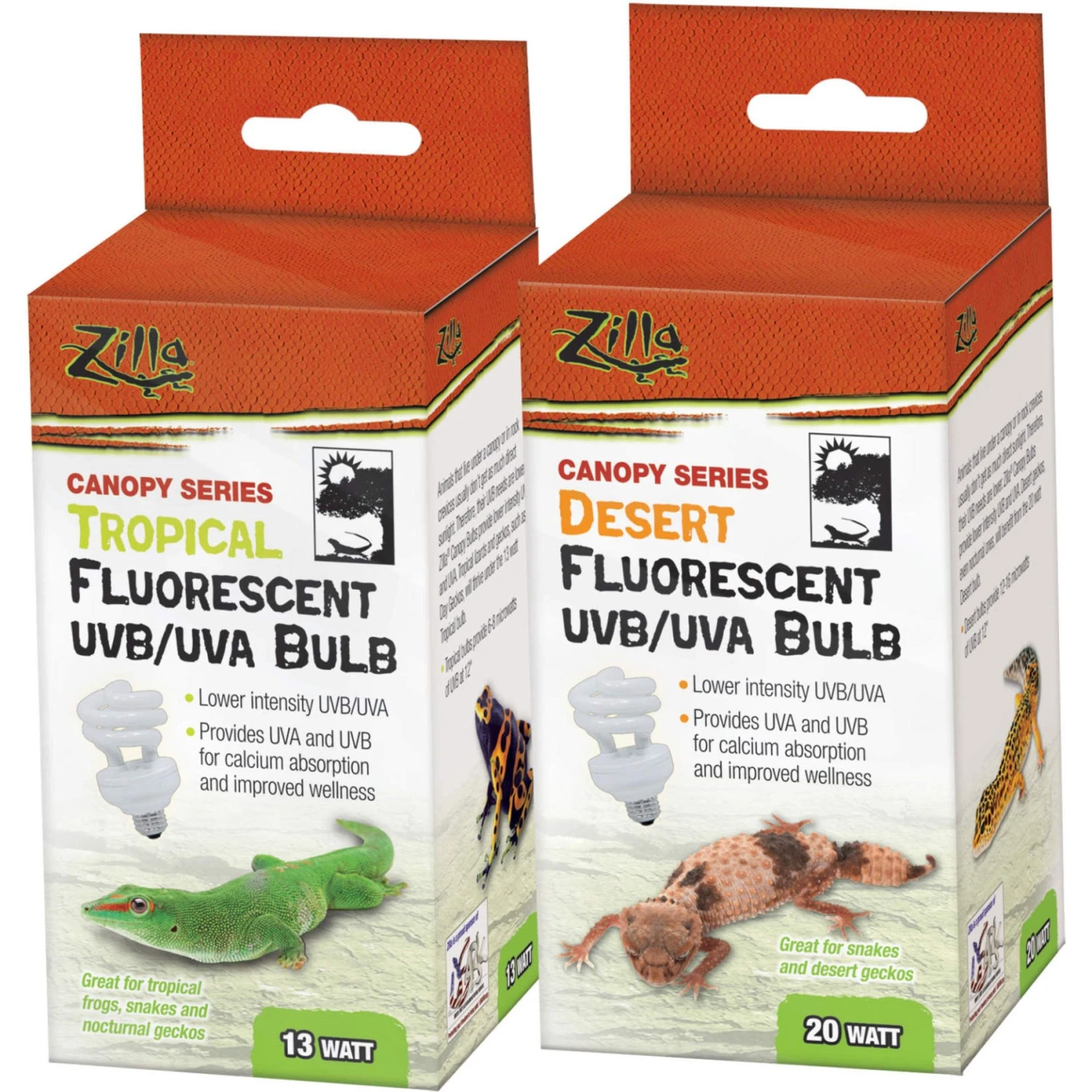 Your cold-blooded cutie naturally prefers to stay under canopies, in rock crevices, and away from too much direct sunlight—so his UVB needs are lower. Zilla Canopy Series Fluorescent UVB/UVA Bulbs are designed to provide lower intensity UVB and UVA rays to meet his specific needs. A great choice for your snake and desert gecko.