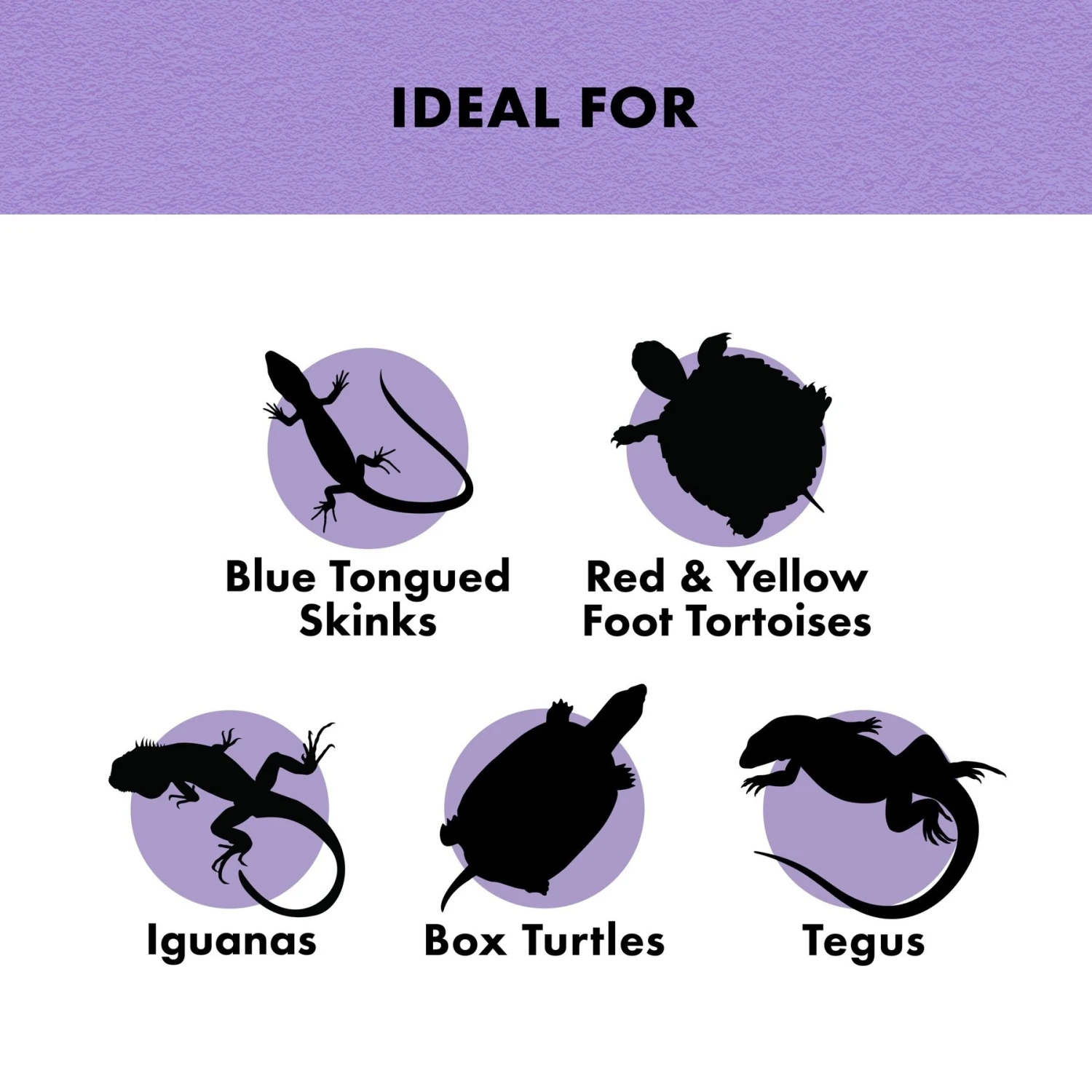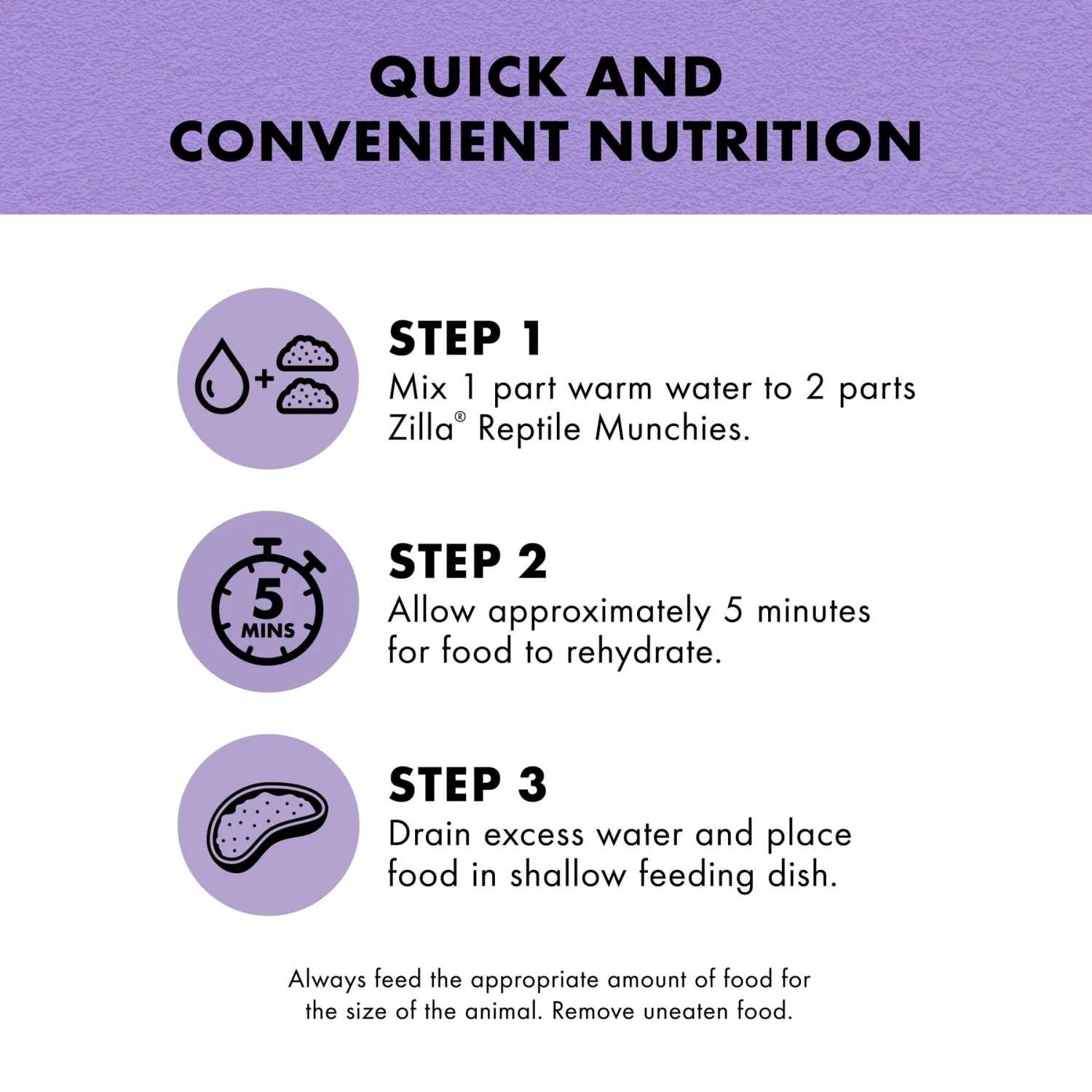 Zilla Reptile Munchies Fruit Mix Reptile Food is a convenient way to feed a variety of reptiles, including iguanas, blue tongued skinks, tegus, box turtles, red and yellow foot tortoises and hermit crabs. This vitamin-packed blend includes select fruits that are freeze-dried to maintain natural nutrients and flavor. It’s easy to store without refrigeration and makes feeding convenient because it’s ready to serve when you add a few drops of water.