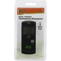 The Zilla Thermometer-Hygrometer for Reptile Terrariums lets you quickly and easily monitor the temperature and relative humidity in your terrarium. These are the two most important environmental variables for keeping reptiles comfortable and in good health. The thermometer tracks temperatures from 23-122 degrees, and the hygrometer can read relative humidity from 30-90 percent. Each parameter has its own probe for more accurate positioning, and both probe wires measure 57 inches to accommodate any size terrarium. The built-in calendar and alarm functions help remind pet owners to check the readout, make feedings or administer medications.